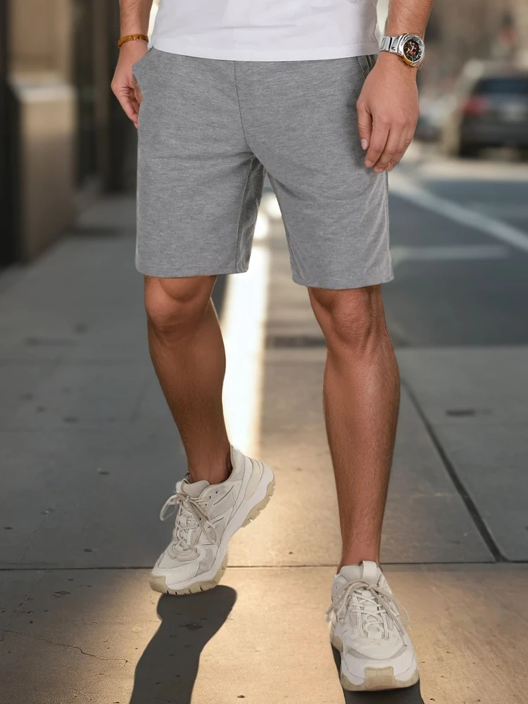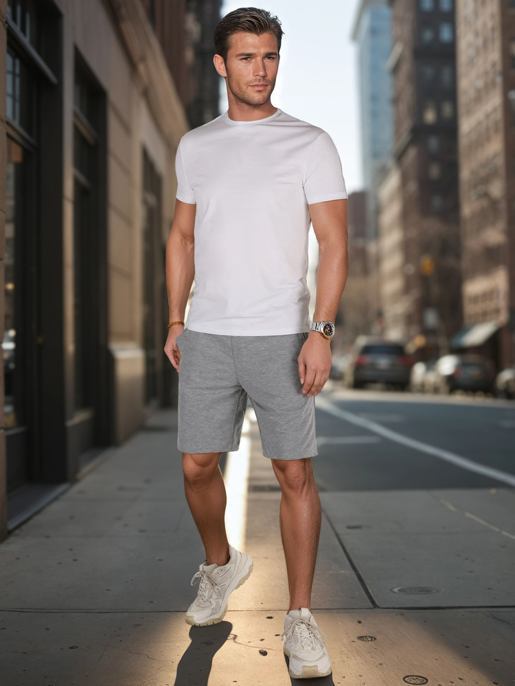 Szorty dresowe męskie o klasycznym fasonie z praktycznymi kieszeniami i troczkiem w pasie. Świetne do noszenia w cieplejsze dni, na co dzień i podczas lekkiej aktywności fizycznej. Przyjemny w dotyku materiał idealnie sprawdza się na wiosnę.