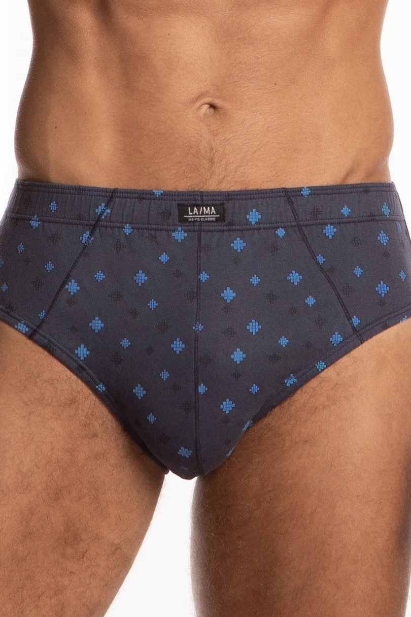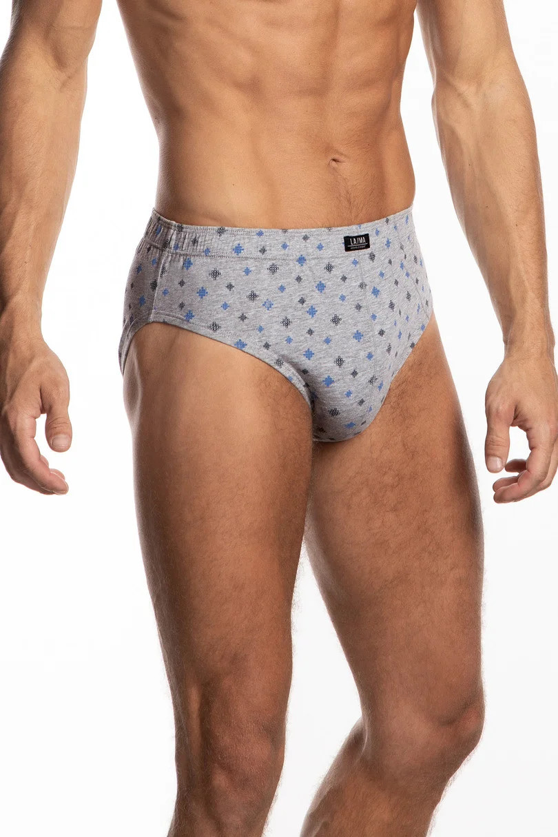 Klasické pánské slipy, postavené boky, v pase pohodlná guma lemovaná bavlnou, balené v krabičce po třech kusech v prezentovaných barvách s jemným potiskem.
