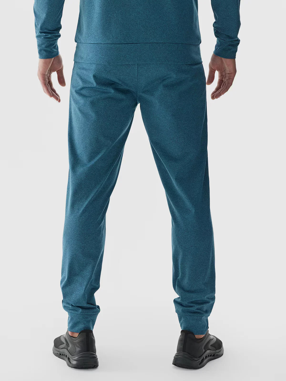 Mají střih regular, který se pohodlně přizpůsobí postavě a zúžené nohavice zakončené elastickým lemem. Vazba na obou stranách interlock pleteniny je stejná. Materiál je odolný a zároveň měkký, dobře padne a absorbuje vlhkost.