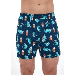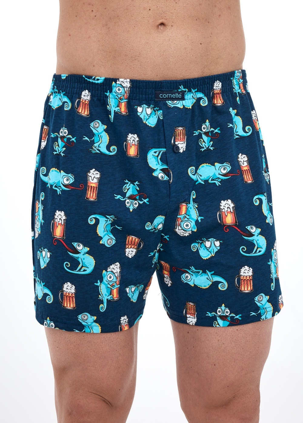 Bavlněné volné trenýrky s veselým motivem od značky Cornette. Trenýrky mají obšitou gumu s nášivkou Cornette na přední části a propínání na knoflíček.
