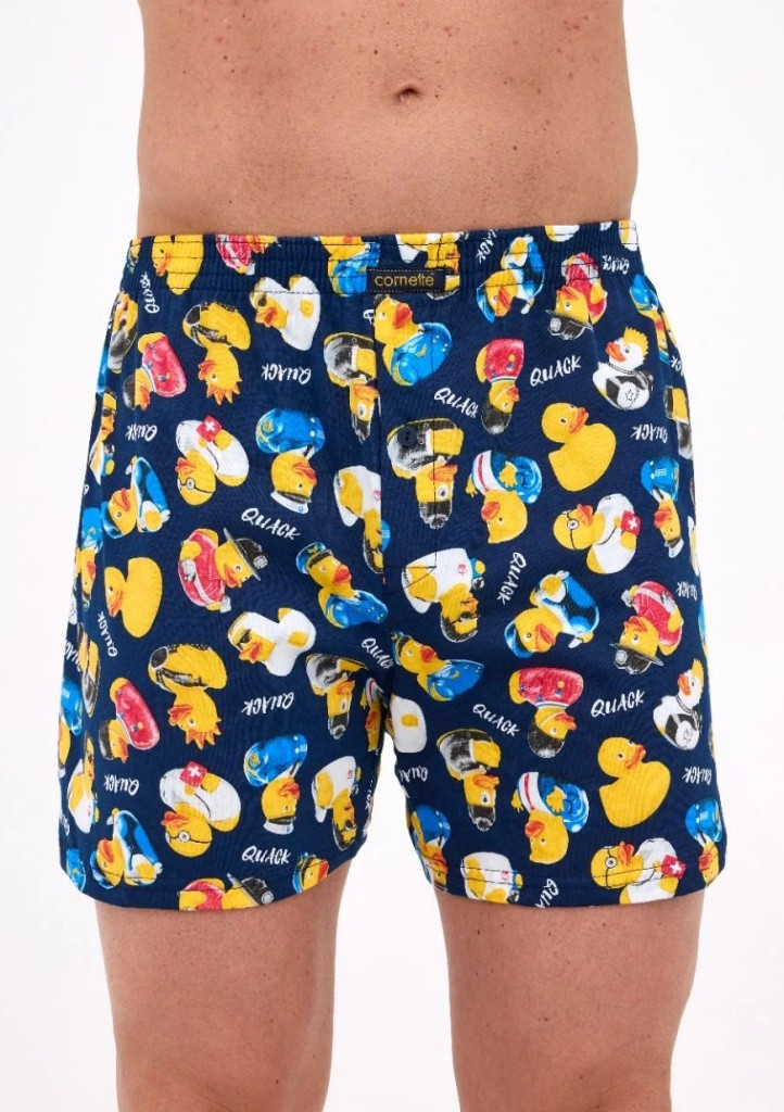 Bavlněné volné trenýrky s veselým motivem od značky Cornette. Trenýrky mají obšitou gumu s nášivkou Cornette na přední části a propínání na knoflíček.