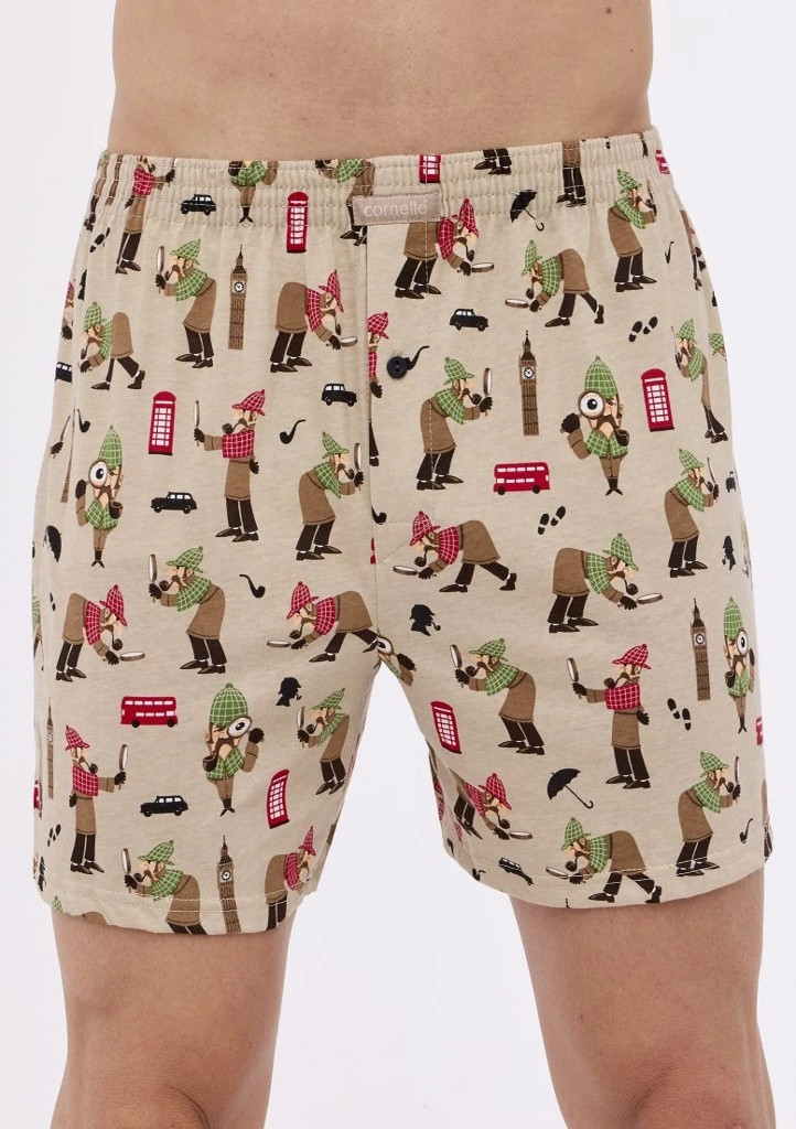 Bavlněné volné trenýrky s veselým motivem od značky Cornette. Trenýrky mají obšitou gumu s nášivkou Cornette na přední části a propínání na knoflíček.