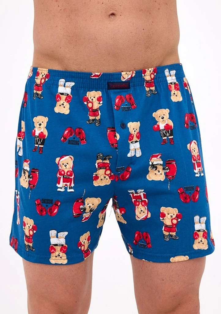 Bavlněné volné trenýrky s veselým motivem od značky Cornette. Trenýrky mají obšitou gumu s nášivkou Cornette na přední části a propínání na knoflíček.