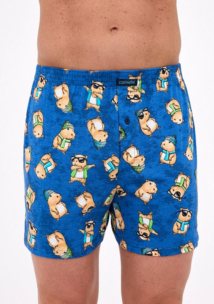 Bavlněné volné trenýrky s veselým motivem od značky Cornette. Trenýrky mají obšitou gumu s nášivkou Cornette na přední části a propínání na knoflíček.