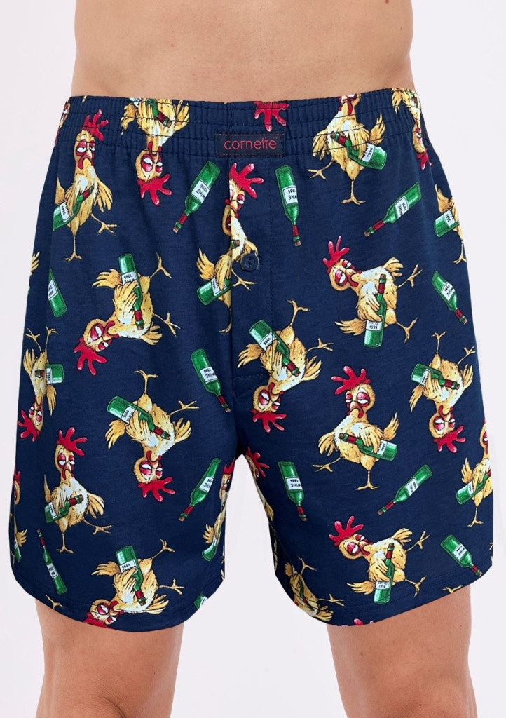 Bavlněné volné trenýrky s veselým motivem od značky Cornette. Trenýrky mají obšitou gumu s nášivkou Cornette na přední části a propínání na knoflíček.