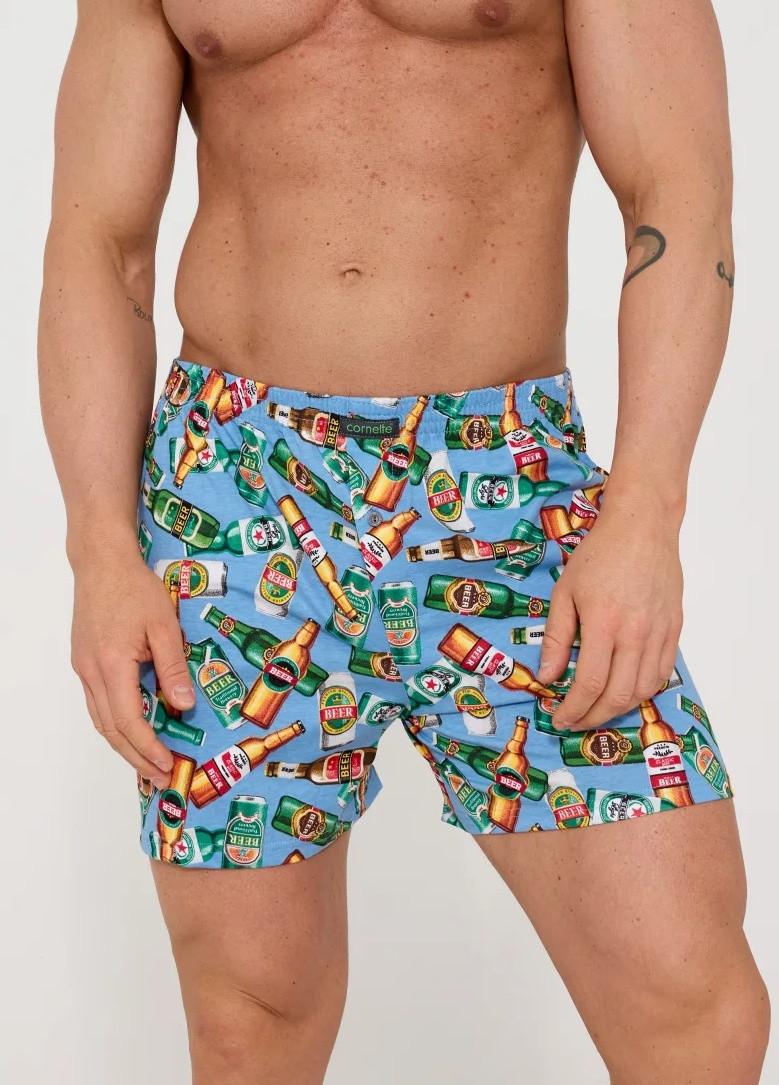 Bavlněné volné trenýrky s veselým motivem od značky Cornette. Trenýrky mají obšitou gumu s nášivkou Cornette na přední části a propínání na knoflíček.