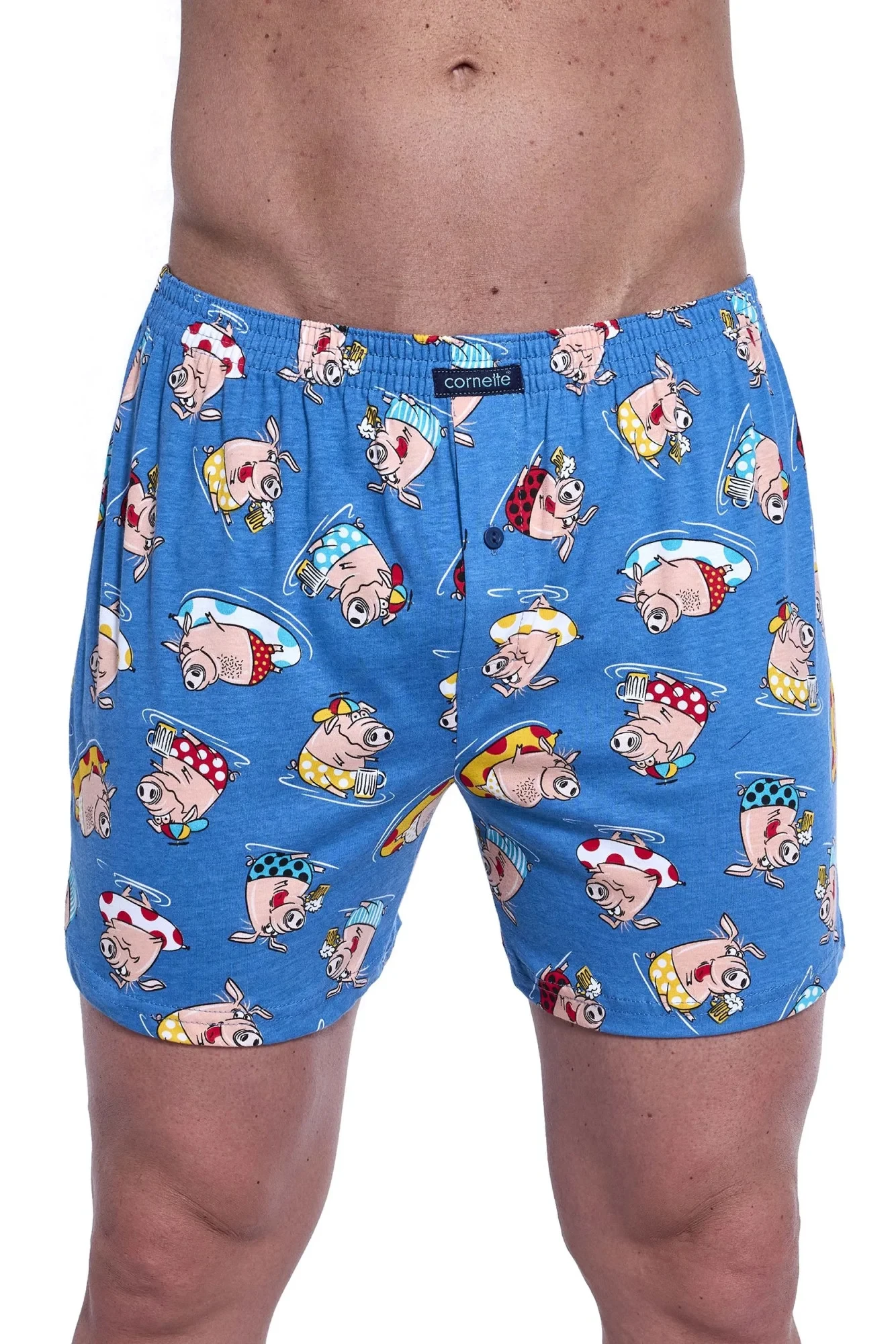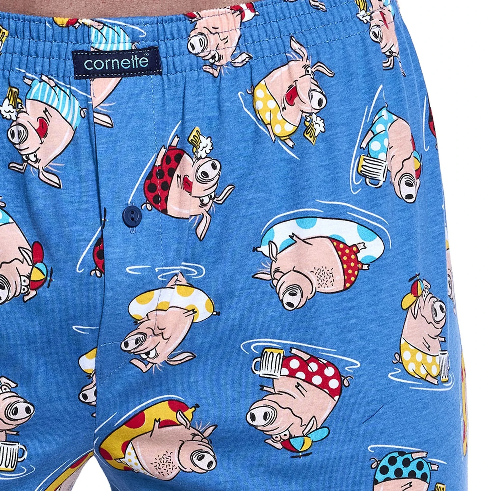 Pánské trenýrky 001/170 Classic CORNETTE - světle modrá barva - z vysoce jakostní bavlny - se zábavným potiskem - volný střih modelu je zárukou pohodlí, které potřebuje a ocení každý muž - pohodlná guma v pase je obšitá bavlnou - rozparek se zapíná na knoflíček