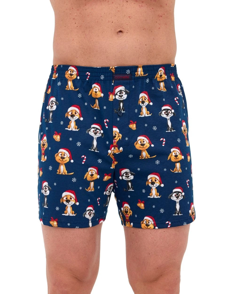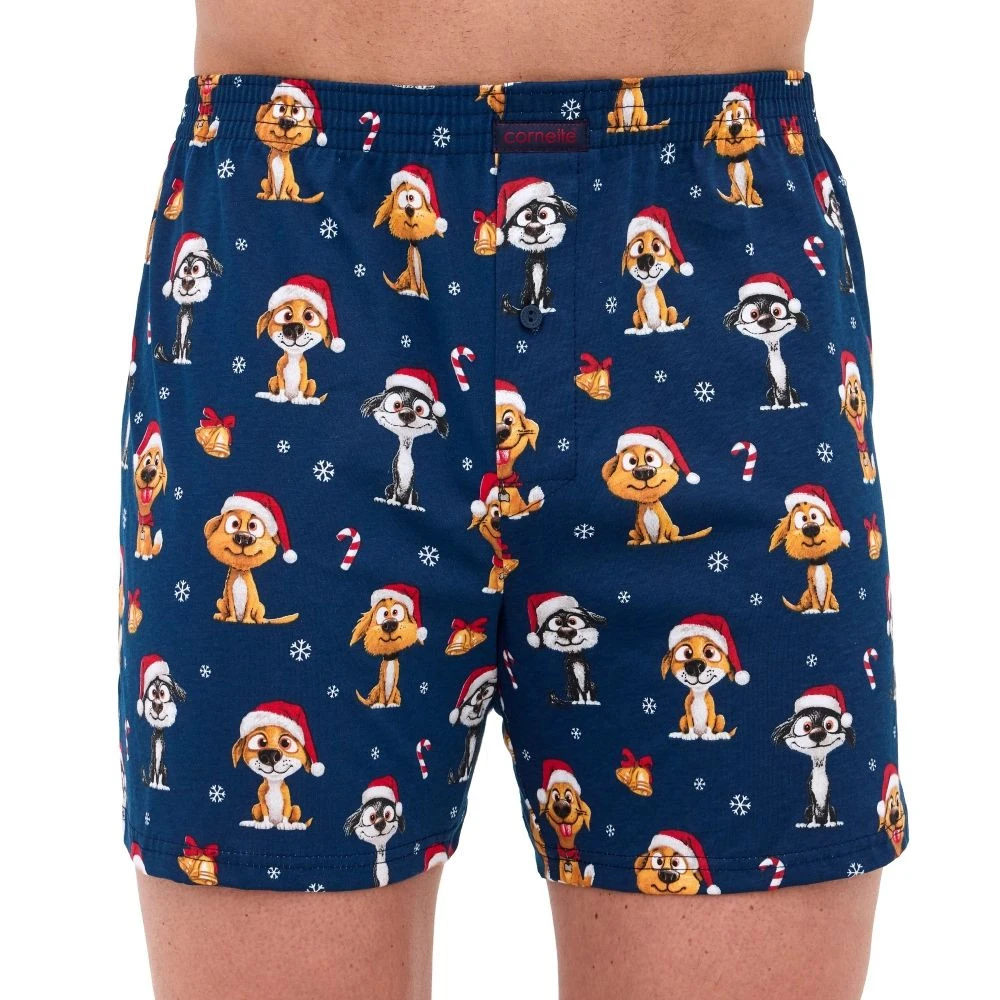 Pánské trenýrky 016/20 Dogs CORNETTE - tmavě modrá barva - volný střih modelu je zárukou pohodlí, které potřebuje a ocení každý muž - pohodlná guma v pase je obšitá bavlnou - rozparek se zapíná na knoflíček - vánoční kolekce