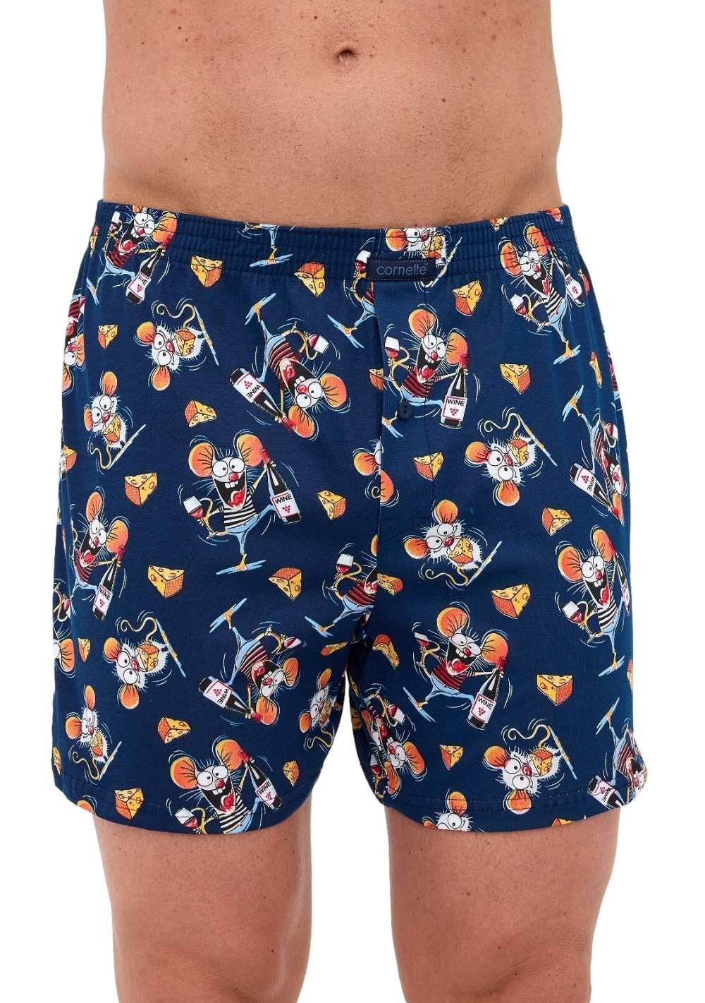 Bavlněné volné trenýrky s veselým motivem od značky Cornette. Trenýrky mají obšitou gumu s nášivkou Cornette na přední části a propínání na knoflíček.