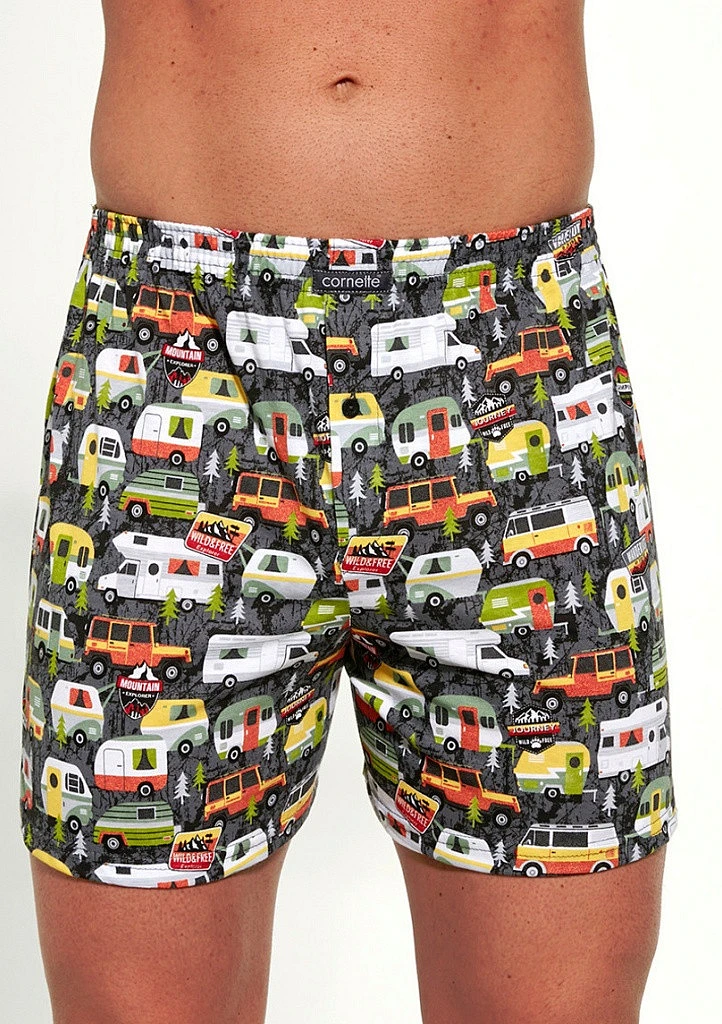 Bavlněné volné trenýrky s veselým motivem od značky Cornette. Trenýrky mají obšitou gumu s nášivkou Cornette na přední části a propínání na knoflíček.