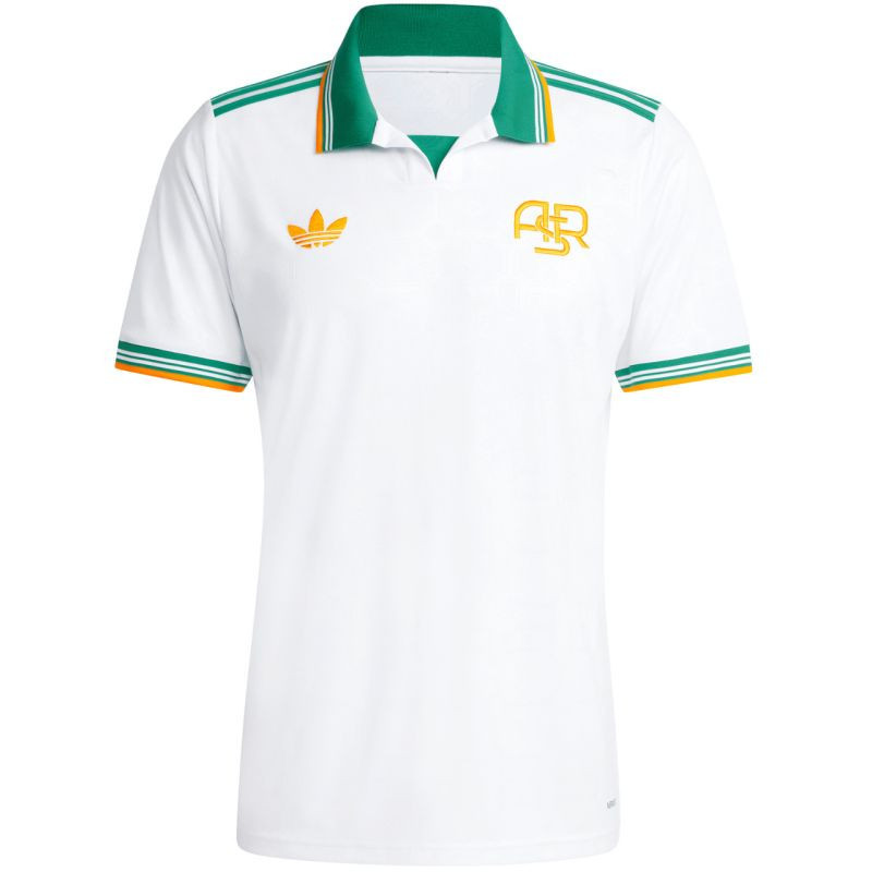 Koszulka męska adidas AS Roma 25/26 Third Jersey biała JJ4185 Męska koszulka AS Roma w trzeciej wersji na sezon 2025/26 pozwoli wyrazić dumę z kibicowania. Na piersi umieszczono kultowe logo adidas Trefoil oraz herb klubu. Technologia Aeroready odprowadza wilgoć do zewnętrznych warstw. Dopasowany krój. Materiał użyty przy produkcji tej koszulki pochodzi z recyklingu. Materiał: 100% poliester
