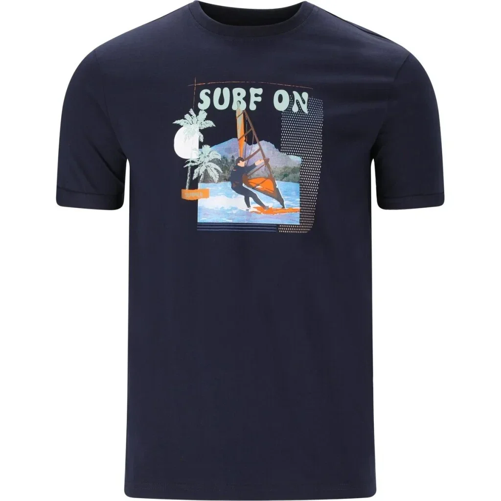 Na přední straně dominuje výrazný potisk s motivem windsurfingu, palmami a nápisem „SURF“, což podtrhuje jeho ležérní, letní charakter.