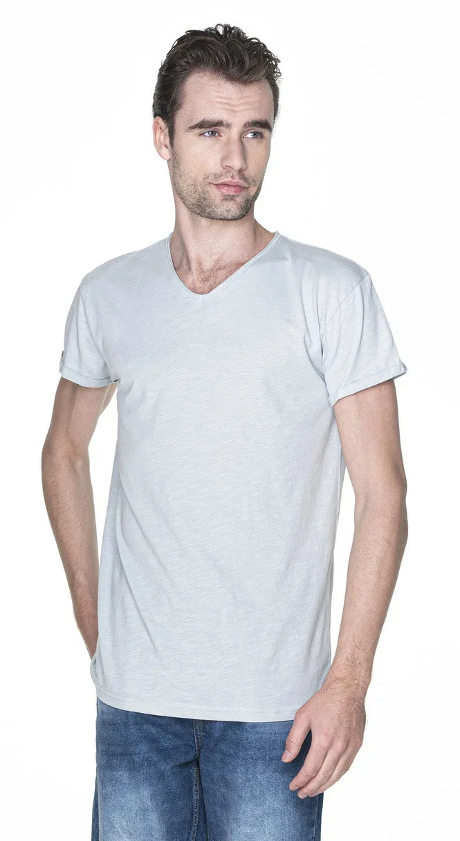 Męski t-shirt z dekoltem typu v-neck z bawełny organicznej. Miękki i przyjemny materiał single jersey typu slub. Surowe wykończenie dekoltu, potrójnie wywinięty i przeszyty brzeg rękawka, taśma wzmacniająca typu twill na karku, taśma wzmacniająca na ramionach, podwójny dolny szew. Skład: 100% bawełna półczesana, gramatura: 150g/m2