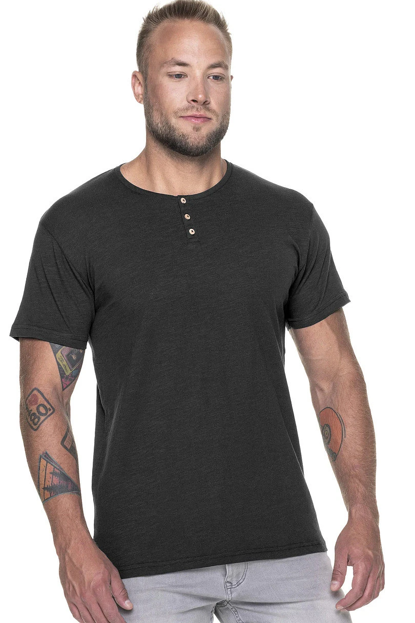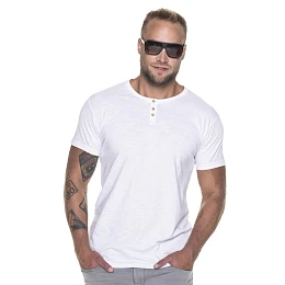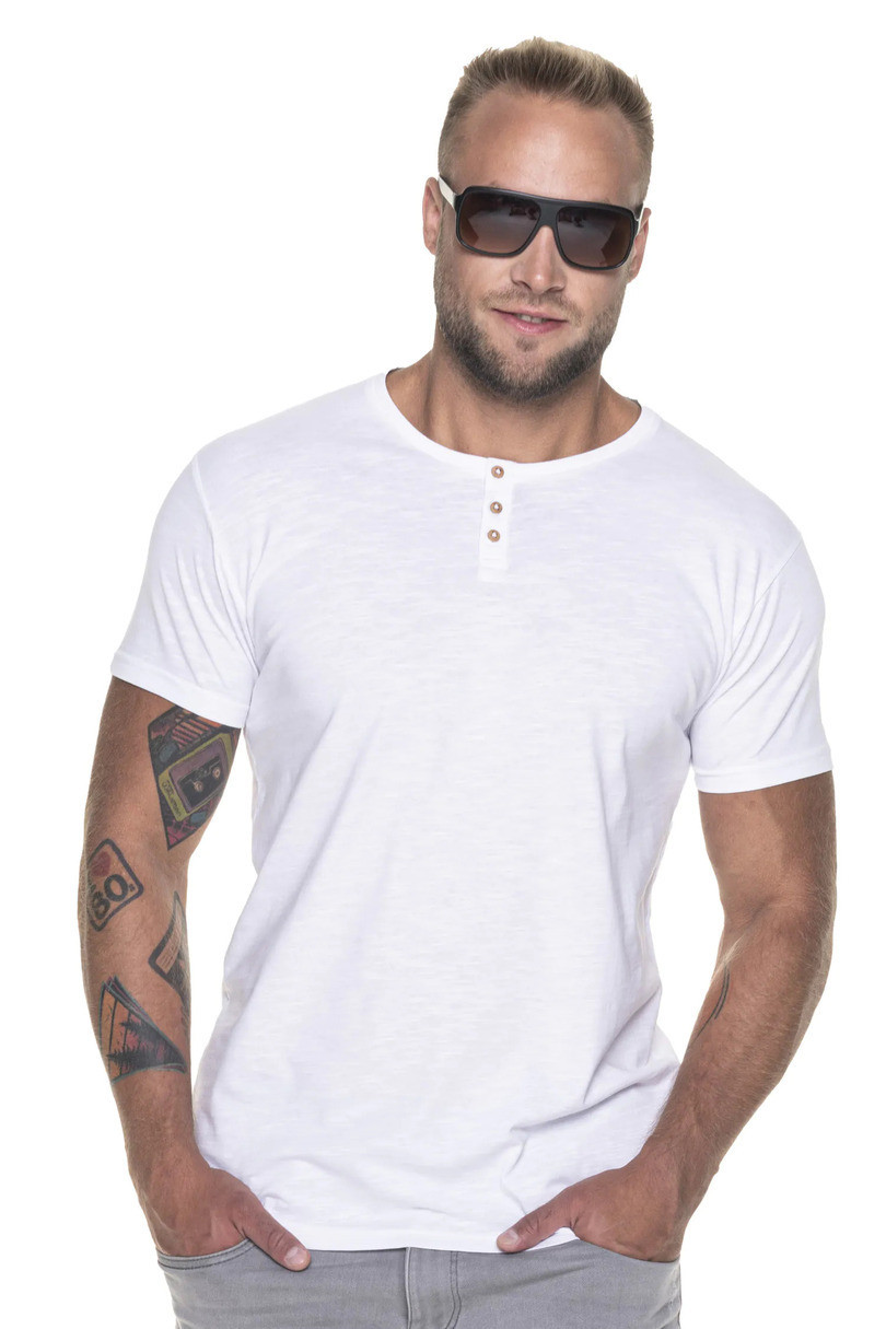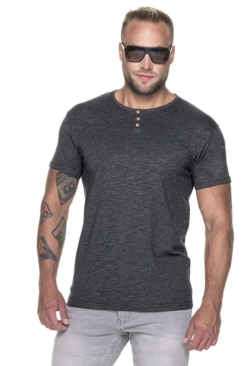 Pánské tričko s knoflíky. Má vypasovaný střih, hladký materiál typu jersey. Kolem krku a na ramenou je zpevňující pruh. Ve výstřihu jsou ozdobné knoflíky. Gramáž: 170g/m2.