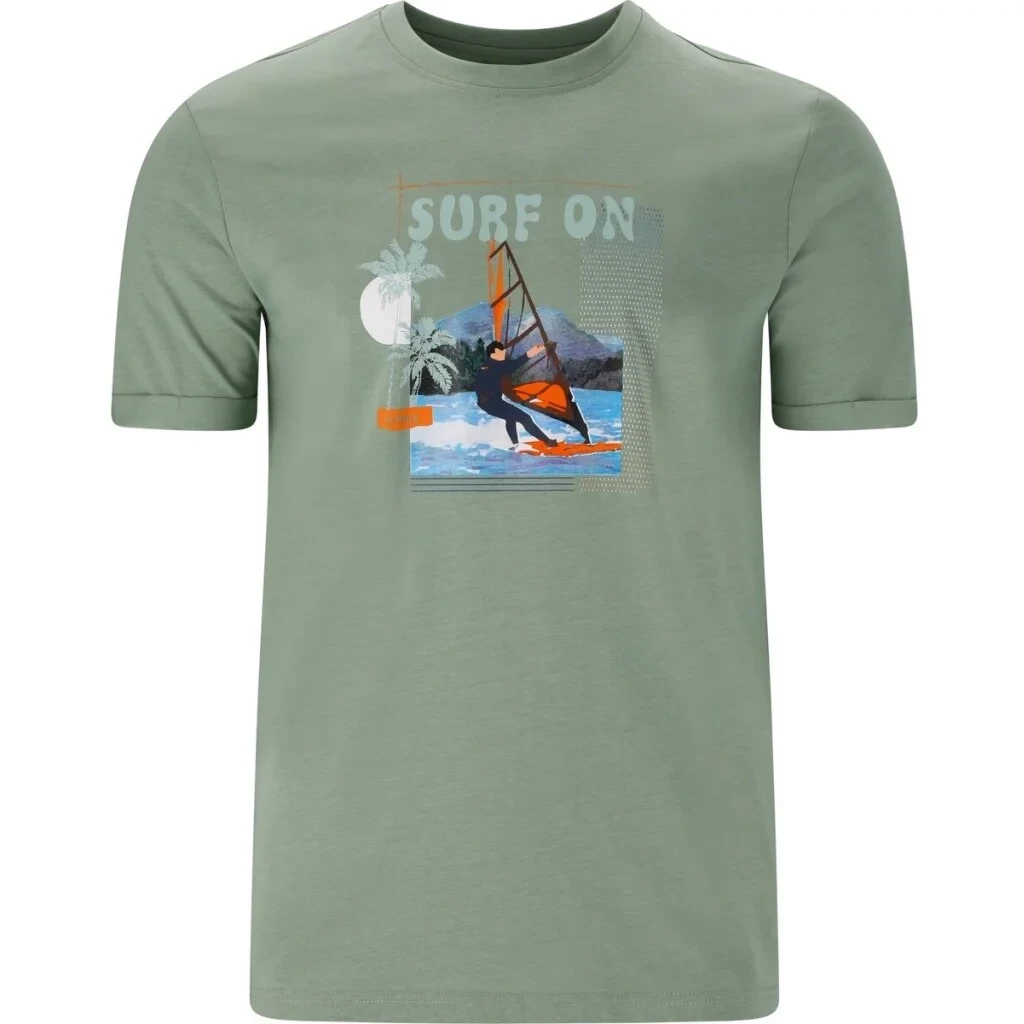 Na přední straně dominuje výrazný potisk s motivem windsurfingu, palmami a nápisem „SURF“, což podtrhuje jeho ležérní, letní charakter.