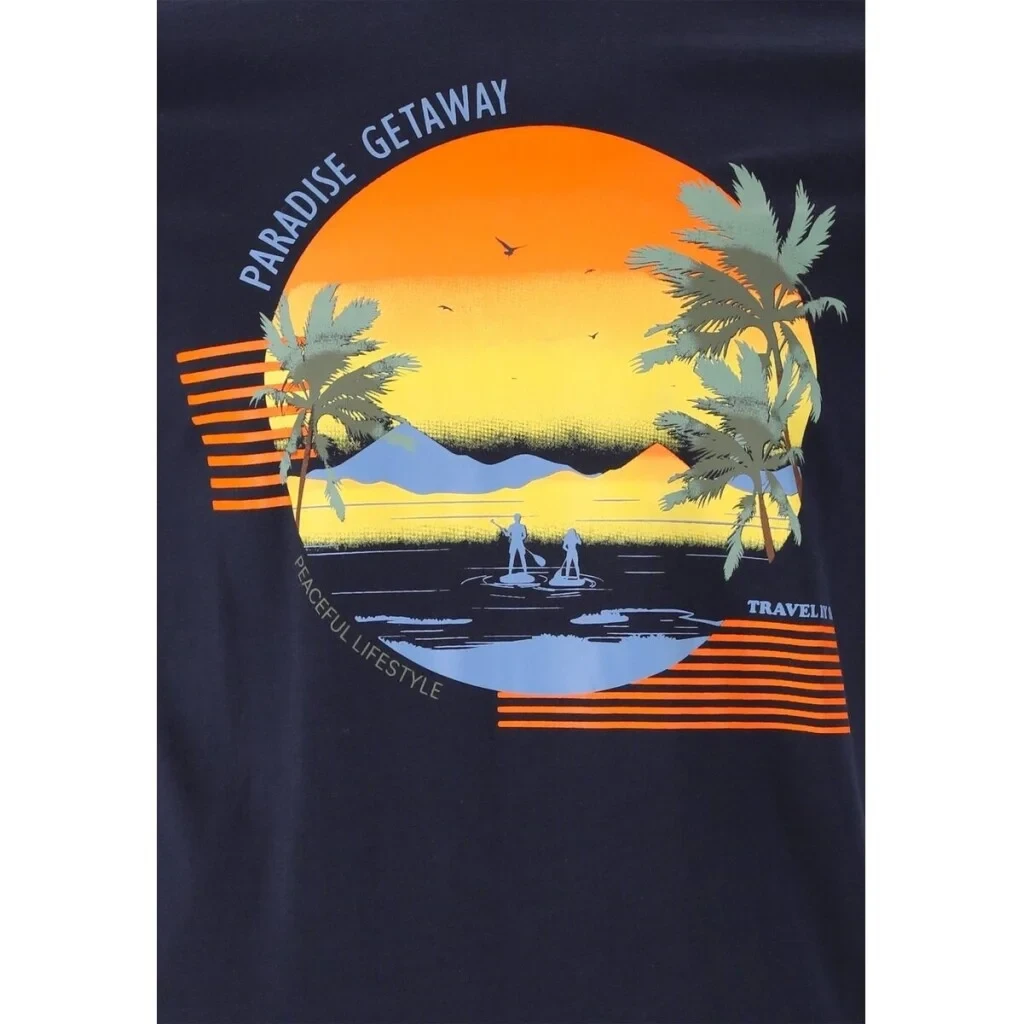 Dominantním prvkem je barevný potisk na hrudi s motivem západu slunce, palem a paddleboardistů, doplněný texty „PARADISE GETAWAY“, „PEACEFUL LIFESTYLE“ a „TRAVEL BY SEA“. Tento design navozuje atmosféru klidu, dobrodružství a letního volného času.