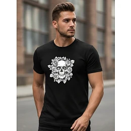 Toto pánské tričko s výrazným potiskem lebky obklopené květinami upoutá pozornost a dodá vzhledu charakter. Grafika kombinuje tmavý motiv s jemnými květinovými prvky a vytváří tak zajímavý kontrast, to vše v ilustrativní estetice s rafinovanými detaily. Model se bude hodit pro každodenní ležérní i streetwearové stylizace.