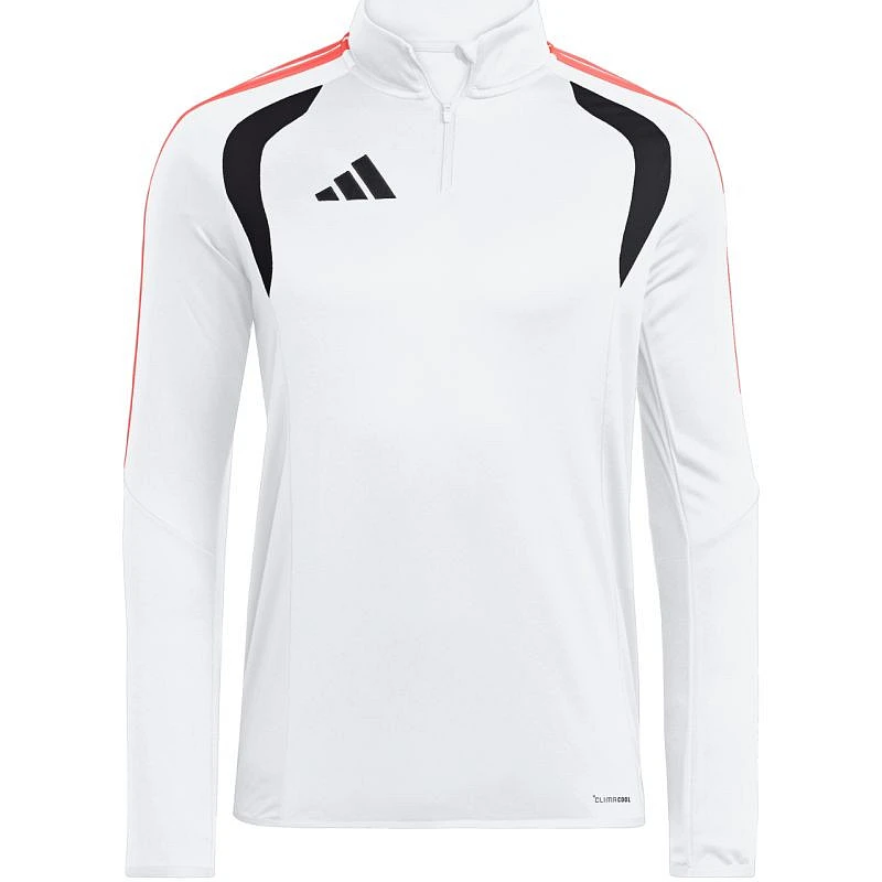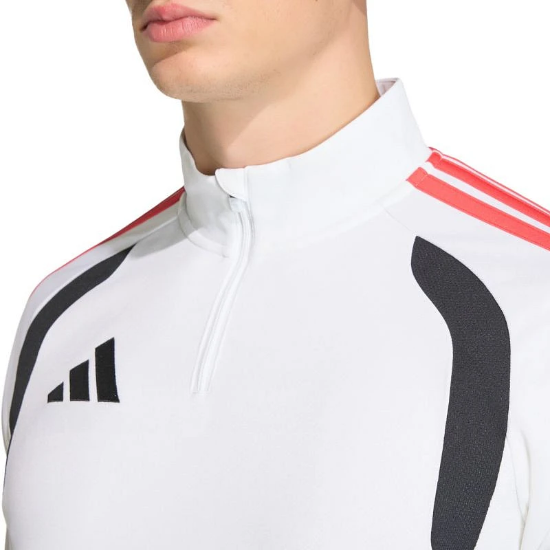 Pánská fotbalová mikina adidas Tiro 26 League Training Top bílá/černá/červená KR0371 Tato pánská fotbalová mikina adidas je ideální na trénink. Zakončená nášivkou na ochranu brady, zapínání na krátký zip. Přiléhavý střih. Technologie Climacool je funkční řešení, které vás udrží v chladu a suchu a umožní vám soustředit se na hru. Spodní část a manžety zakončené elastickým lemováním. Kontrastní síťované vsadky. Pruhy na rukávech. Jemné logo na hrudi. Materiál: 100% recyklovaný polyester.