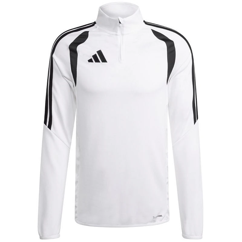 Bluza męska adidas Tiro 26 League Training Top biała KC1260 Bluza piłkarska adidas przeznaczona dla mężczyzn sprawdzi się podczas treningów. Wykończony patką chroniącą podbródek, krótki zamek. Dopasowany krój. Technologia Climacool jest funkcjonalnym rozwiązaniem, które zapewnia uczucie chłodu i suchości oraz skupienie na grze. Dół oraz mankiety wykończono elastyczną lamówką. Kontrastowe, siateczkowe wstawki. Paski na rękawach. Subtelne logo na piersi. Materiał: 100% poliester z recyklingu