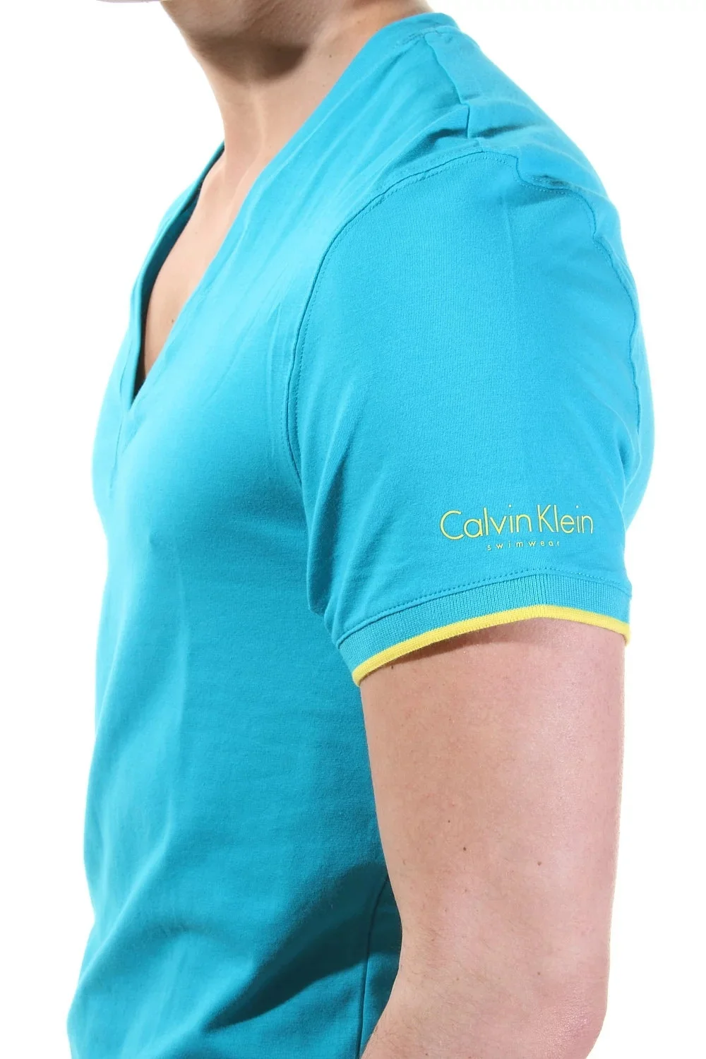 Triko 58260Z3 má výstřřih do V, na bocích rozparky a krátké rukávy zdobí žlutý lem a nápis Calvin Klein.