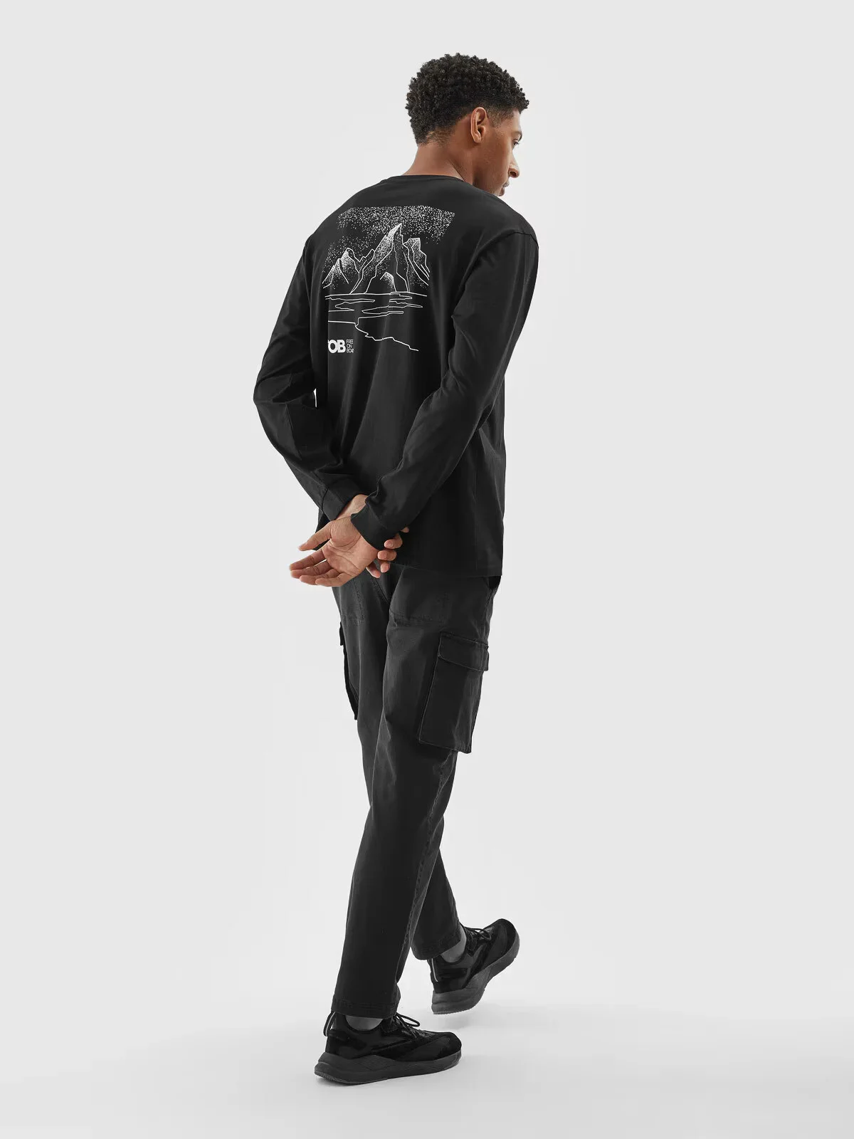 Pánský top s dlouhým rukávem je vyroben ze 100% bavlny, díky čemuž je měkký, odolný a příjemný na dotek. Kulatý výstřih je zakončen mírným žebrováním. Na zadní straně je viditelný potisk s motivem hor. Viditelný nápis "FOB" na přední straně.
