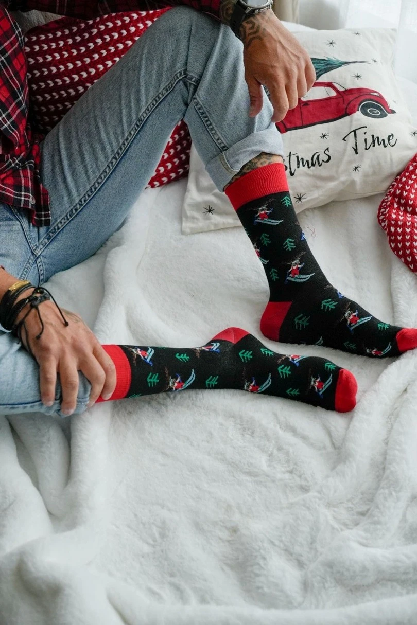 Pánské vánoční ponožky Sen na lyžích jsou ideálním způsobem, jak dodat vašemu oblečení nádech humoru a sváteční atmosféry. Jsou vyrobeny z vysoce kvalitní bavlny, jsou měkké, příjemné na dotek a poskytují vynikající celodenní pohodlí. Elastický materiál zaručuje dokonalé přizpůsobení noze, zatímco veselý design se sobem na lyžích vnáší zimní atmosféru. Jsou skvělou volbou jak jako dárek, tak pro každodenní nošení během svátečního období.