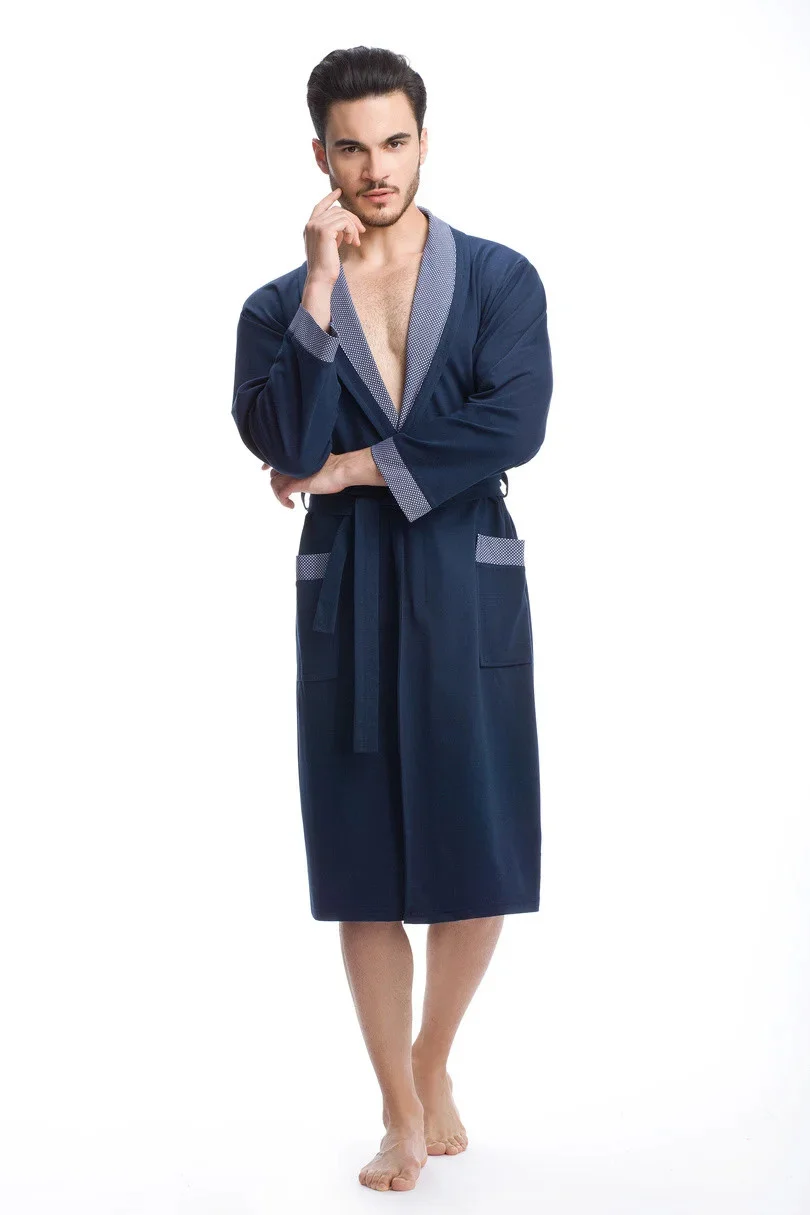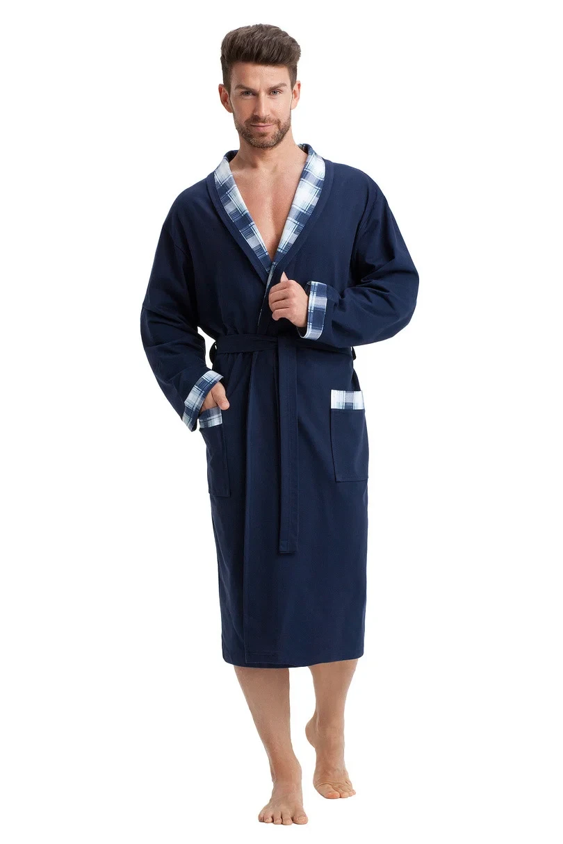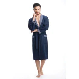 Pohodlný pánský župan, zavazování v pase, límec a kapsy zakončené kontrastní látkou.