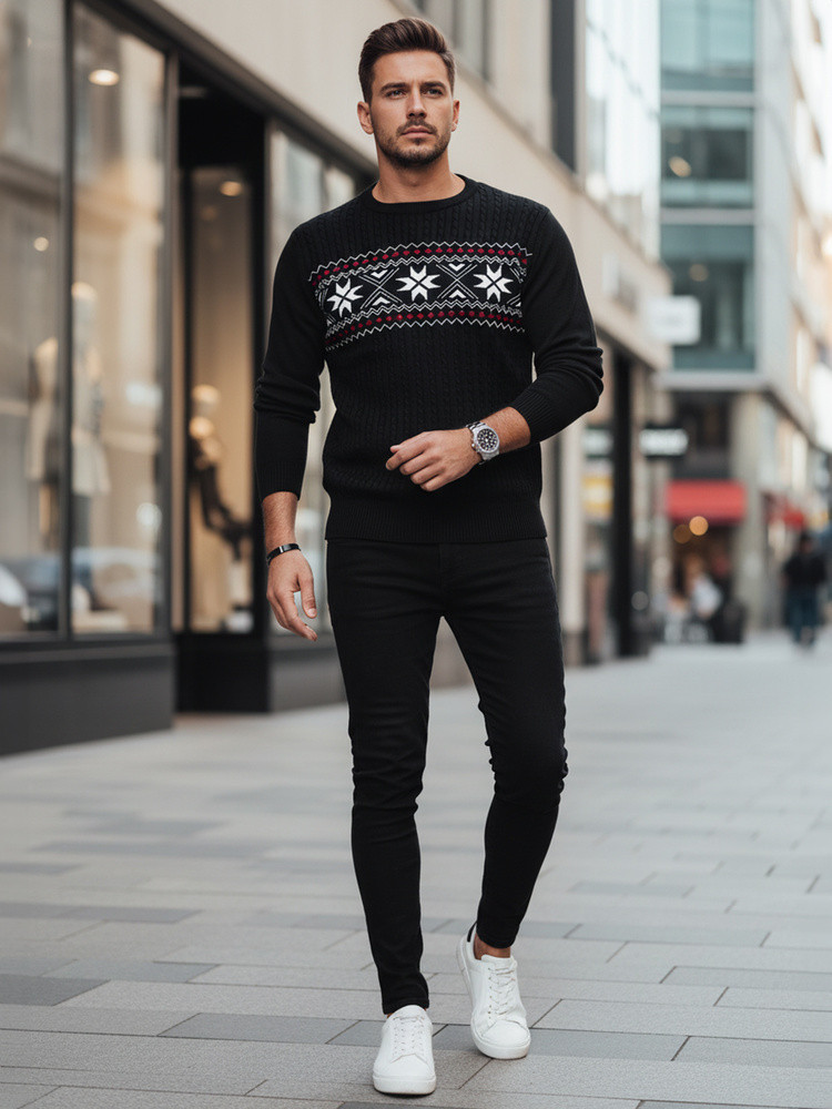Stylowy sweter, który łączy elegancję z wygodą. Idealny na chłodniejsze dni, sprawdzi się w casualowych stylizacjach oraz jako baza do bardziej formalnych zestawów. Wzór inspirowany zimowymi motywami dodaje charakteru, a miękka tkanina zapewnia komfort przez cały dzień. Doskonały wybór na wieczorne wyjścia i codzienne spotkania w chłodniejszym sezonie.