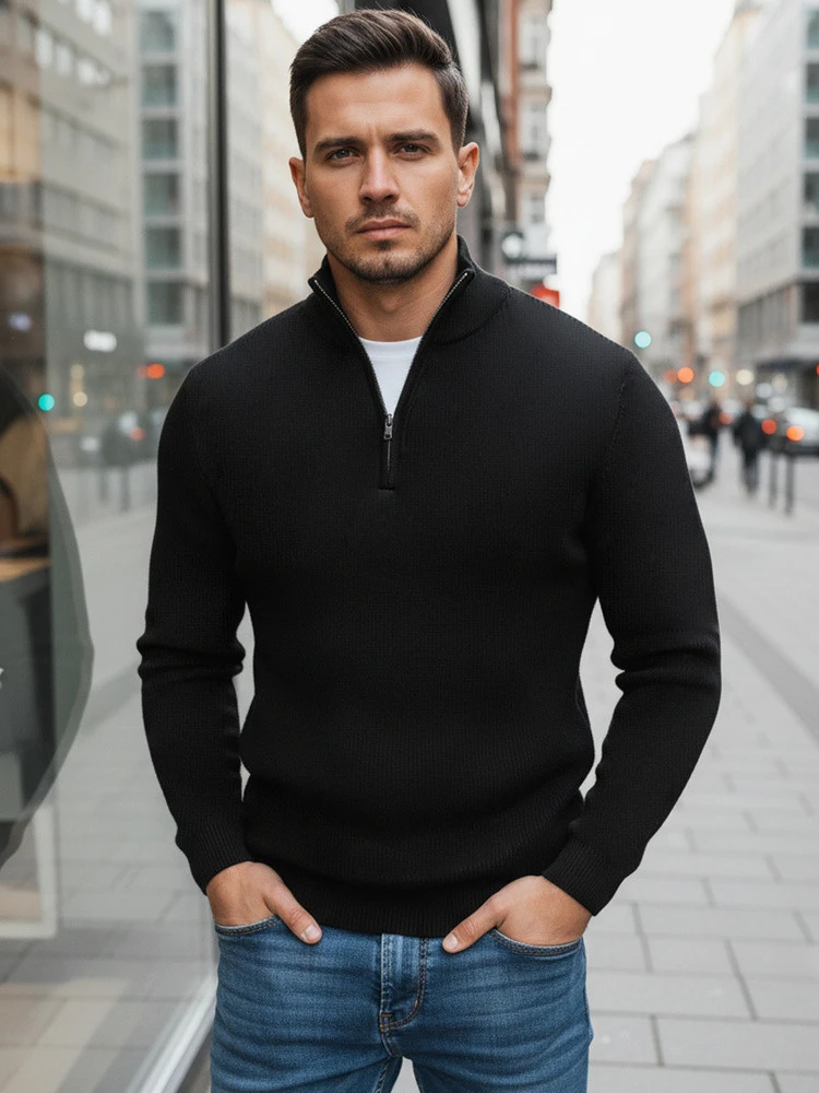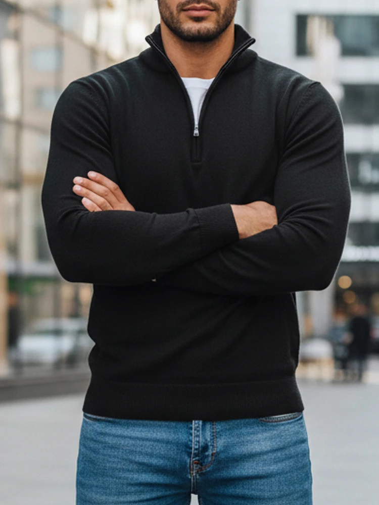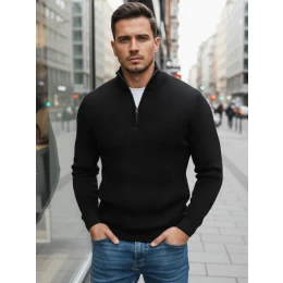 Pletenina s příměsí viskózy je příjemná na dotek a dobře sedí na těle. Střih s mírným stojáčkem představuje moderní styl a černá barva zvyšuje univerzálnost, takže svetr můžete snadno kombinovat s džínami nebo kalhotami chinos. Polozip zvyšuje funkčnost, takže model je vhodný pro různé teploty a příležitosti.