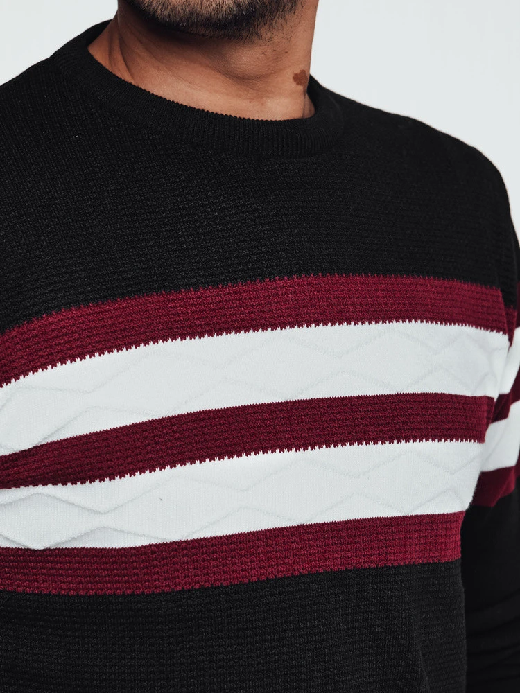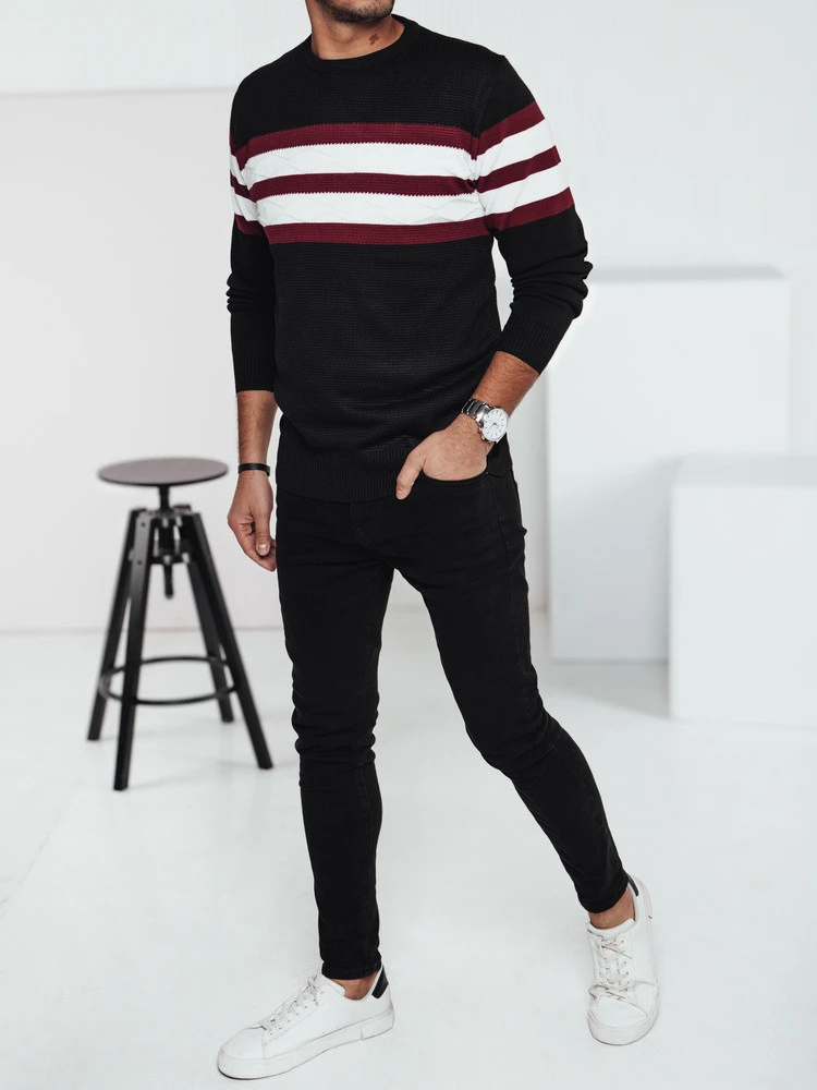 Tento elegantní pánský svetr moderního střihu je ideální volbou pro chladnější dny. Je vyroben z úpletu příjemného na dotek a poskytuje pohodlí a volnost pohybu. Výrazné pruhy mu dodávají stylový nádech, takže se skvěle hodí pro běžné i formálnější příležitosti. Ideální je k džínám a látkovým kalhotám.