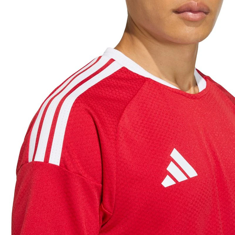 Pánské soutěžní zápasové tričko adidas Tiro 26 červenobílé KA6173 Toto pánské tričko adidas je ideální zápasové tričko na fotbal. Přizpůsobený střih. Kulatý výstřih s měkkým límečkem. Síťované panely. Technologie Climacool odvádí a rozptyluje pot. Recyklovaná vlákna. Logo s tepelným přenosem. Pruhy na ramenou. Materiál: 100% recyklovaný polyester.