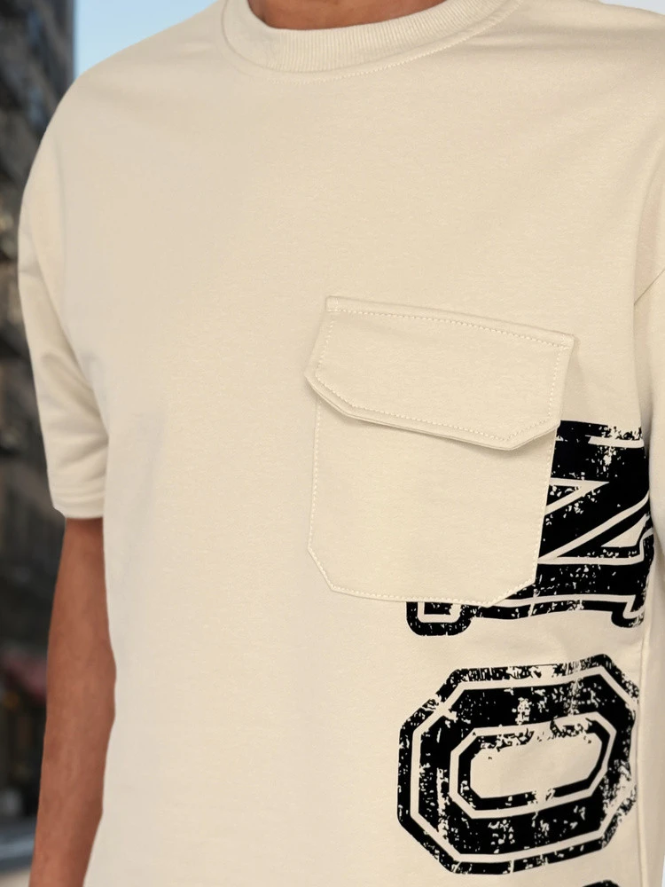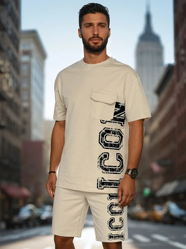 Męski komplet dresowy składający się z t-shirta i krótkich spodenek to nowoczesna propozycja dla fanów wygodnego stylu. Koszulka posiada oryginalny nadruk z napisem "ICON" i kieszonkę z klapką, a krótkie spodenki wyposażone są w elastyczny pas ze sznurkiem oraz zamki w kieszeniach. Całość świetnie sprawdza się w miejskich stylizacjach, na ciepłe dni wiosny.