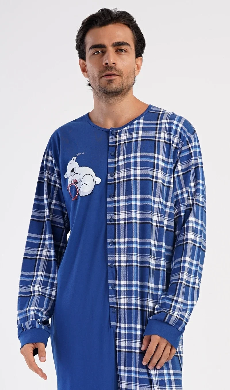 Pánský bavlněný overal Méďa Ospalec. Celopropínací overal zaručuje pohodlné spaní, rukávy a nohavice jsou zakončeny elastickým lemem. Overal se pohledově skládá ze dvou polovin. Jednobarevné, kterou zdobí obrázek ledního medvěda, a kárované, z tohoto materiálu je ušitý i zadní díl a rukávy. Použitý bavlněný materiál je příjemný a poddajný na dotek.