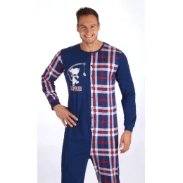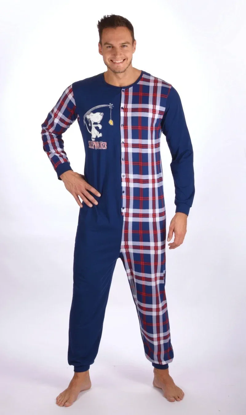 Pánský bavlněný overal Sleepwalker. Overal je celopropínací, z jedné strany zdobený obrázkem myši a z druhé strany károvaným potiskem. Dlouhé nohavice jsou ukončeny elastickými lemy. Bavlněný materiál je poddajný a příjemný na dotek.