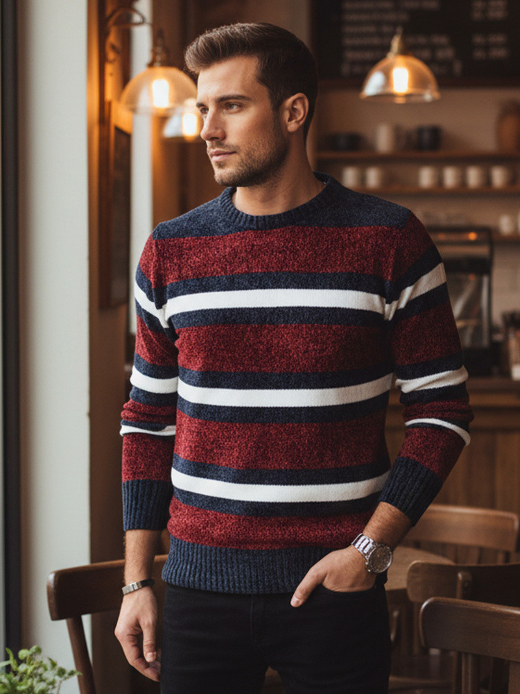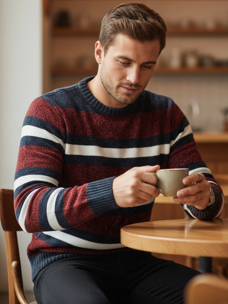 Tento klasický pánský pruhovaný svetr je nezbytným doplňkem pro chladnější dny. Je vyroben z příjemného materiálu a poskytuje pohodlí a teplo po celý den. Díky stylové barevné kombinaci se svetr skvěle hodí k různým outfitům - od ležérních až po elegantnější. Je mimořádně měkký na dotek, ideální pro každodenní nošení, do práce nebo na setkání s přáteli a hodí se k džínám i chinos kalhotám, čímž působí jedinečně.