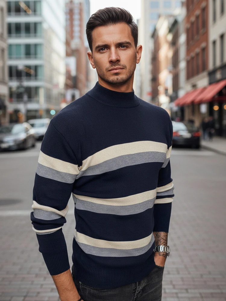 Pánský pruhovaný svetr s polovičním rolákem tmavě modrý FashionStreet WX2126