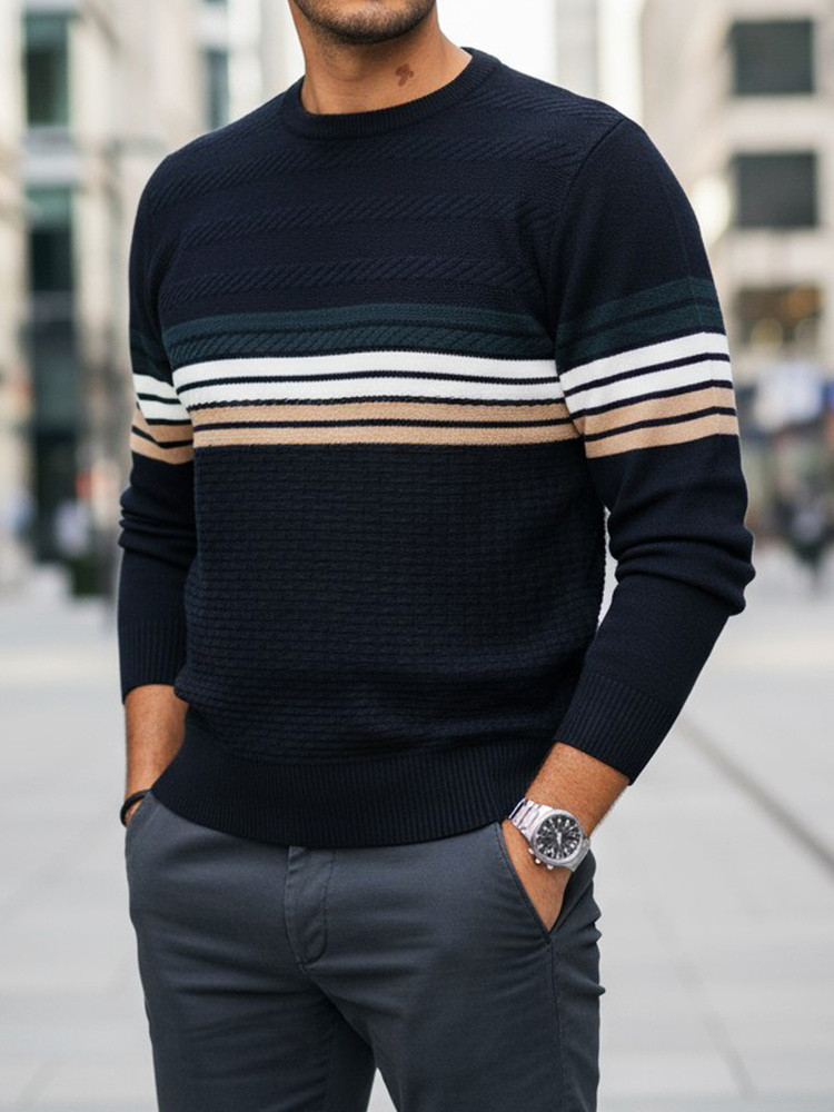 Stylowy męski sweter z poziomymi pasami to połączenie klasyki i nowoczesności. Wykonany z miękkiej dzianiny o wysokiej zawartości wełny, gwarantuje komfort cieplny i wygodę noszenia. Subtelna faktura materiału oraz kontrastowe paski na piersi nadają mu wyrazisty, miejski charakter.