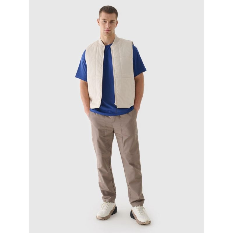 bezrękawnik puchowy ze stójką męski to lekka i funkcjonalna warstwa docieplająca, idealna zarówno do codziennego użytkowania, jak i aktywności sportowych w cieplejsze dni okresu przejściowego. Dzięki niewielkiej wadze nie obciąża sylwetki podczas ruchu, a jednocześnie skutecznie chroni przed chłodem – szczególnie jako element ubioru warstwowego noszony pod kurtką z membraną. Bezrękawnik łatwo się składa i przechowuje, co czyni go praktycznym wyborem w podróży i na co dzień. Pikowanie w kwadraty, tworzące efekt szachownicy, nadaje mu nowoczesny wygląd i zapewnia równomierne rozłożenie ociepliny. Krój regular wygodnie dopasowuje się do sylwetki, a standardowa długość do bioder gwarantuje komfort noszenia. Lekka ocieplina syntetyczna z poliestru zapewnia odpowiedni poziom ciepła, jest miękka i łatwa w pielęgnacji. Zastosowana hydrofobowa impregnacja ogranicza wchłanianie wilgoci, sprawiając, że krople wody swobodnie spływają po materiale .