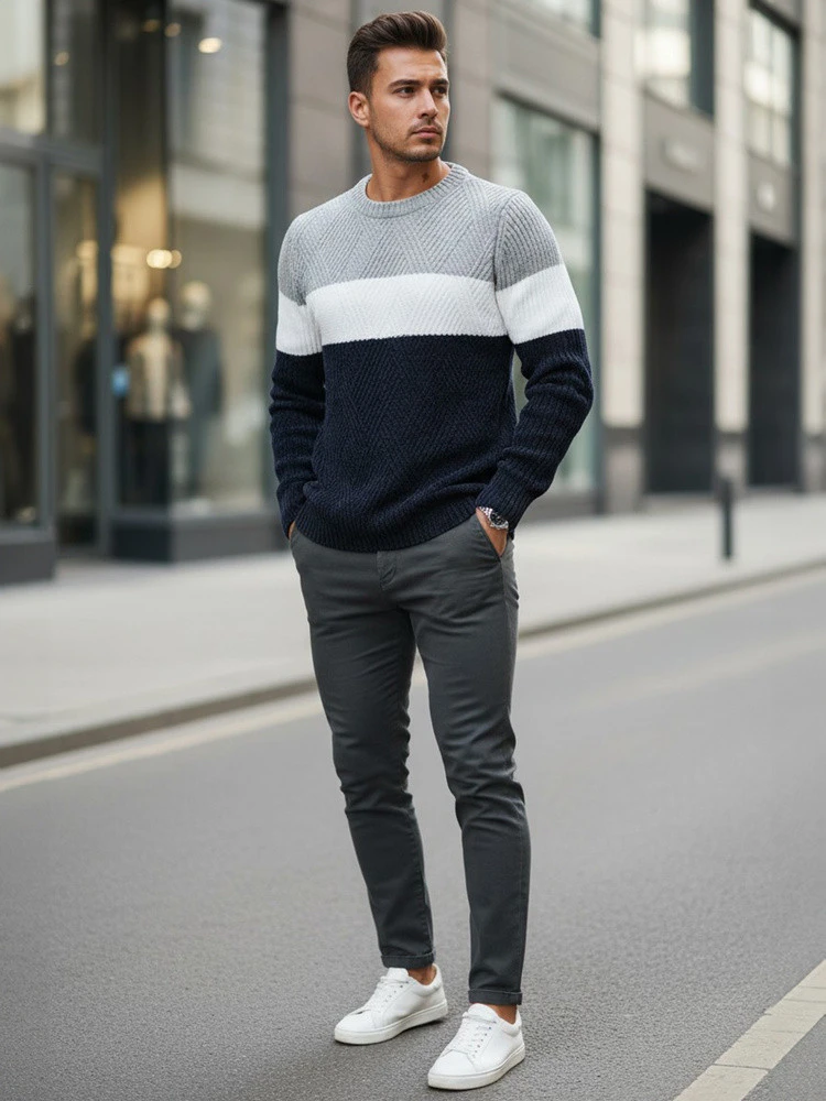 Sweter męski o klasycznym kroju z okrągłym dekoltem to połączenie wygody i ponadczasowego stylu. Wykonany z miękkiej, przyjemnej w dotyku dzianiny, zapewnia komfort cieplny w chłodniejsze dni. Trójkolorowa kompozycja dodaje mu nowoczesnego charakteru i sprawia, że pasuje do wielu casualowych stylizacji.