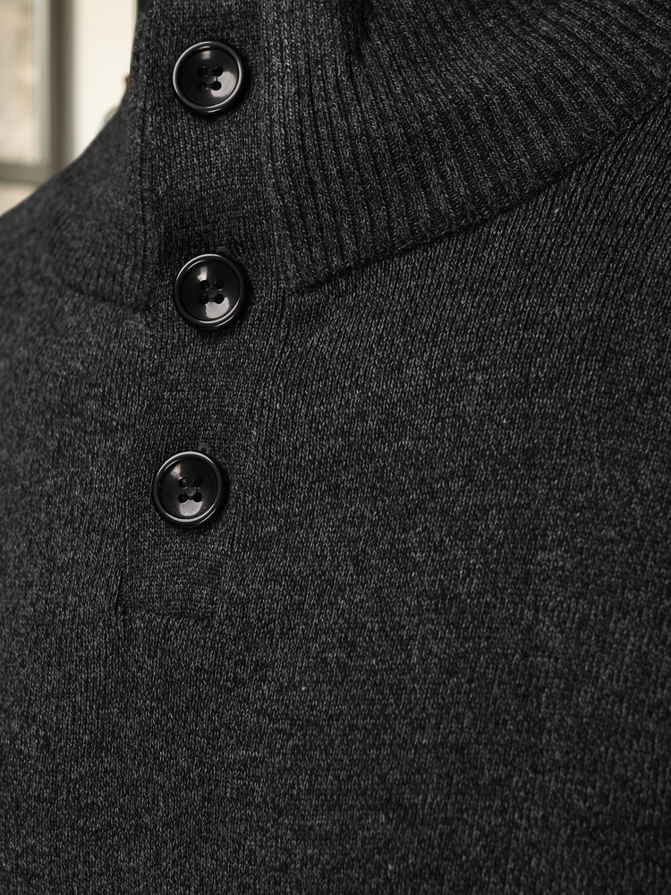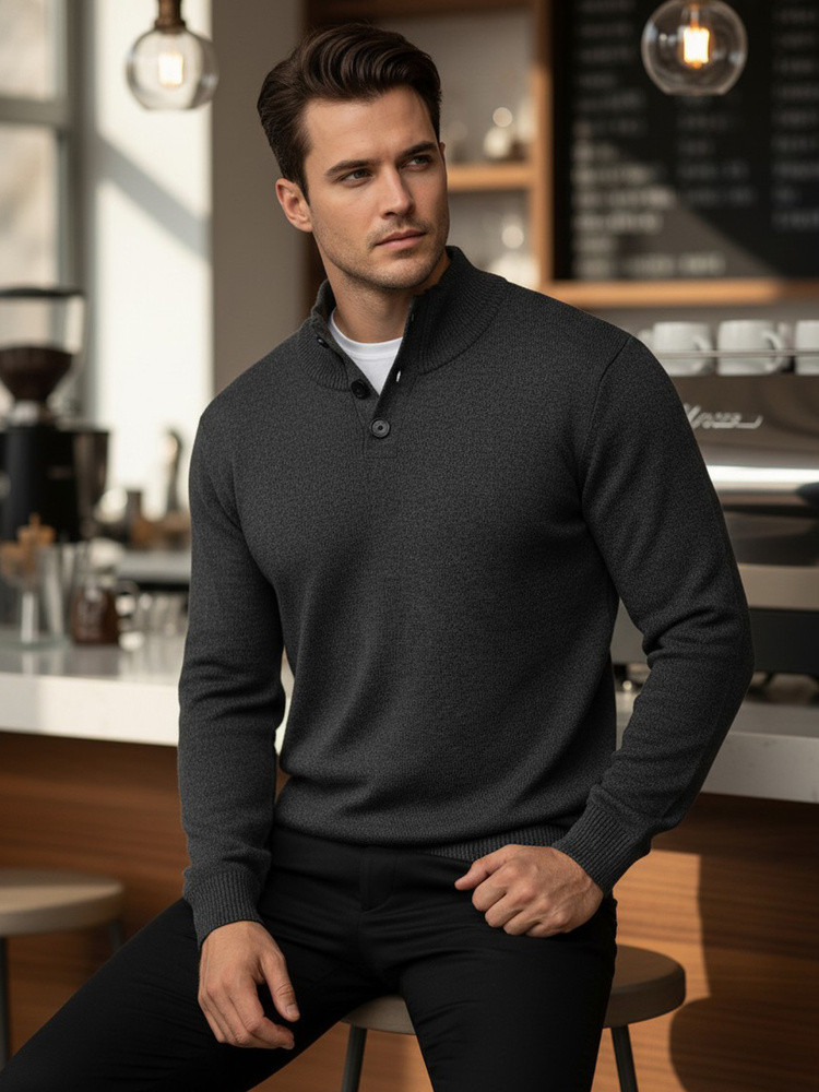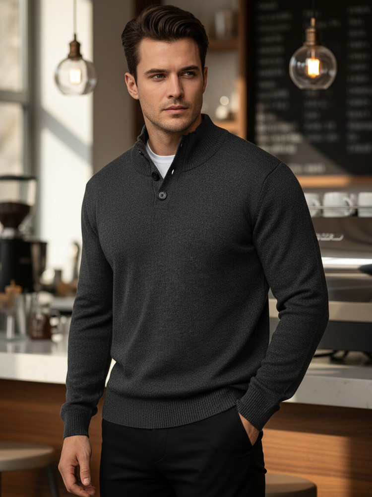 Sweter dobrze współgra z T-shirtem lub koszulą, tworząc uporządkowany, męski look. Dzięki stójce zapinanej na guziki zyskuje subtelny, elegancki akcent, który pozostaje wygodny i niewymuszony. Model sprawdzi się w stylizacjach weekendowych, biznesowych i codziennych.
