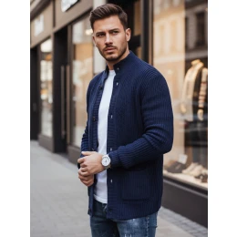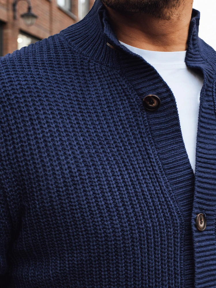 Hustá a křehká pletenina zlepšuje tepelný komfort a díky klasickému střihu je svetr vhodný jak pro ležérní stylizaci, tak pro strukturovanější komplety. Zapínání na knoflíky umožňuje rychle upravit stupeň prodyšnosti a tmavě modrá barva usnadňuje kombinování svetru s různými kusy oblečení.