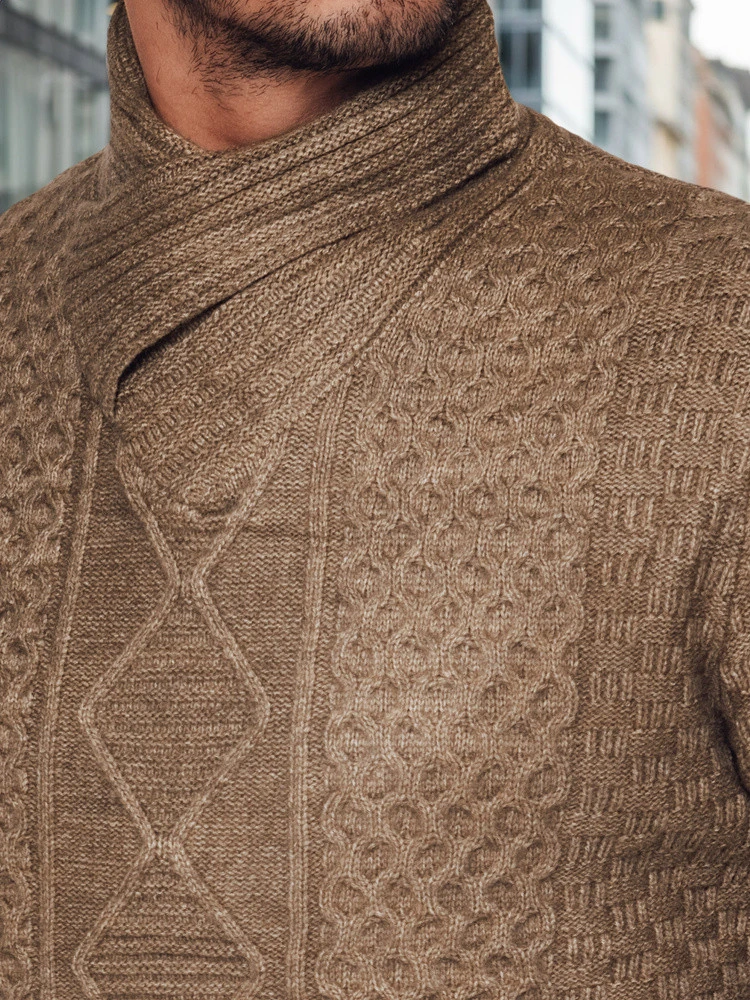 Stylowy, męski sweter z efektowną fakturą i charakterystycznym kołnierzem typu szalowego. Wykonany z wysokiej jakości materiału, zapewnia ciepło i wygodę noszenia. Idealny na chłodniejsze dni, kiedy liczy się zarówno komfort, jak i elegancki wygląd. Pasuje do jeansów i eleganckich spodni.