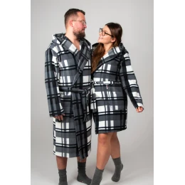 Model wyposażony jest w praktyczny kaptur, który zwiększa komfort termiczny i dodaje szlafrokowi bardziej swobodnego, domowego charakteru. Wiązanie w pasie pozwala na idealne dopasowanie do sylwetki, a pojemne kieszenie zapewniają funkcjonalność — można w nich schować drobiazgi lub ogrzać dłonie.