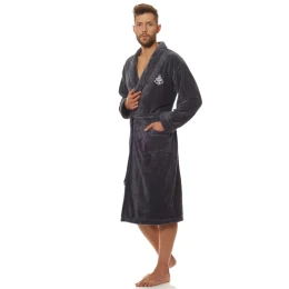 Pánský župan klasického střihu 2114 Marine L&L - z měkké tkaniny velmi příjemné na dotyk - v grafitové barvě - na hrudi má malou nášivku - zavazuje se v pase páskem - na bocích jsou našité kapsy - s šálovým límcem