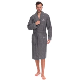 Stylowy i komfortowy szlafrok męski 2532 to doskonały wybór dla mężczyzn ceniących elegancję i wygodę. Wykonany w 100% z miękkiej, oddychającej bawełny, zapewnia przyjemne ciepło oraz pełen komfort noszenia. Klasyczny krój z kołnierzem szalowym i subtelne wykończenia nadają mu ponadczasowy charakter. Szlafrok w stonowanym, szarym kolorze doskonale sprawdzi się na chłodne poranki i wieczory, po kąpieli lub podczas domowego odpoczynku. Idealny prezent dla mężczyzny, który ceni styl i jakość.