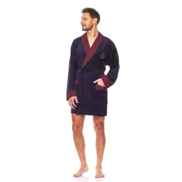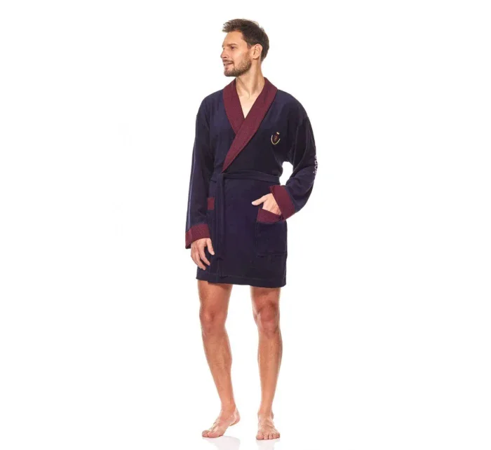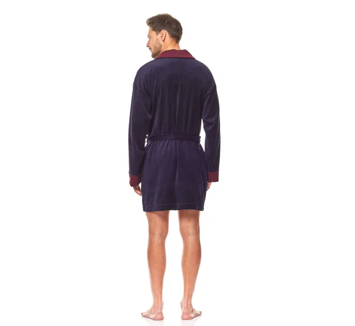 Pánský krátký župan 9101 L&L - z veluru - tmavě modré barvy - na hrudi má malou nášivku - manžety, kapsy a šálový límec jsou olemované - bez zapínání, zavazuje se v pase páskem - s šálovým límcem - délka nad kolena