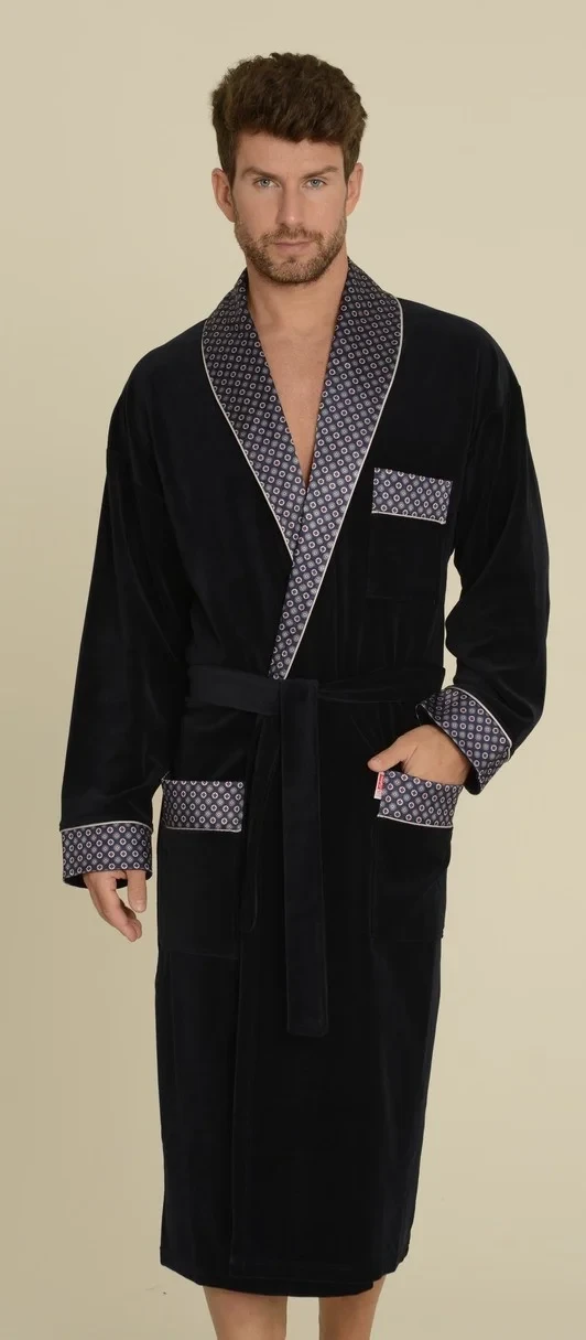 Pánský velurový župan s límcem, v Podvazkový páse na zavázání a dvěma našitými kapsami na bocích a jednou na hrudi. Manžety, límec a kapsy jsou zakončené vzorovaným saténem.