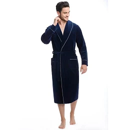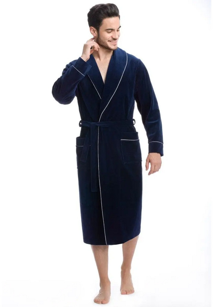 Pánský župan značky Dorota. Župan je ušitý z příjemného, hřejivého velurového materiálu. Župan má okolo krku širší límec, který je olemovaný světlým lemem, který dále pokračuje po stranách županu. Lem je našitý okolo rukávů a kapes županu. Župan má našité kapsy, má opasek, který drží na přišitých poutkách. Župan má délku do poloviny lýtek.
