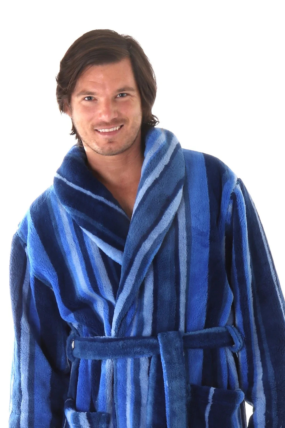 Dlouhý hřejivý pánský župan pro aktivní muže. Svěží modrá spolu s nestárnoucími pruhy se v této kombinaci vyjímá na materiálu wellsoft s hustým vlasem, který je nejen báječně hřejivý, ale také velmi příjemný na omak. Pohodlný střih se šálovým límcem zajišťuje komfort při nošení. Kombinace svěžích odstínů modré v nadčasovém vzoru pro všechny věkové skupiny.