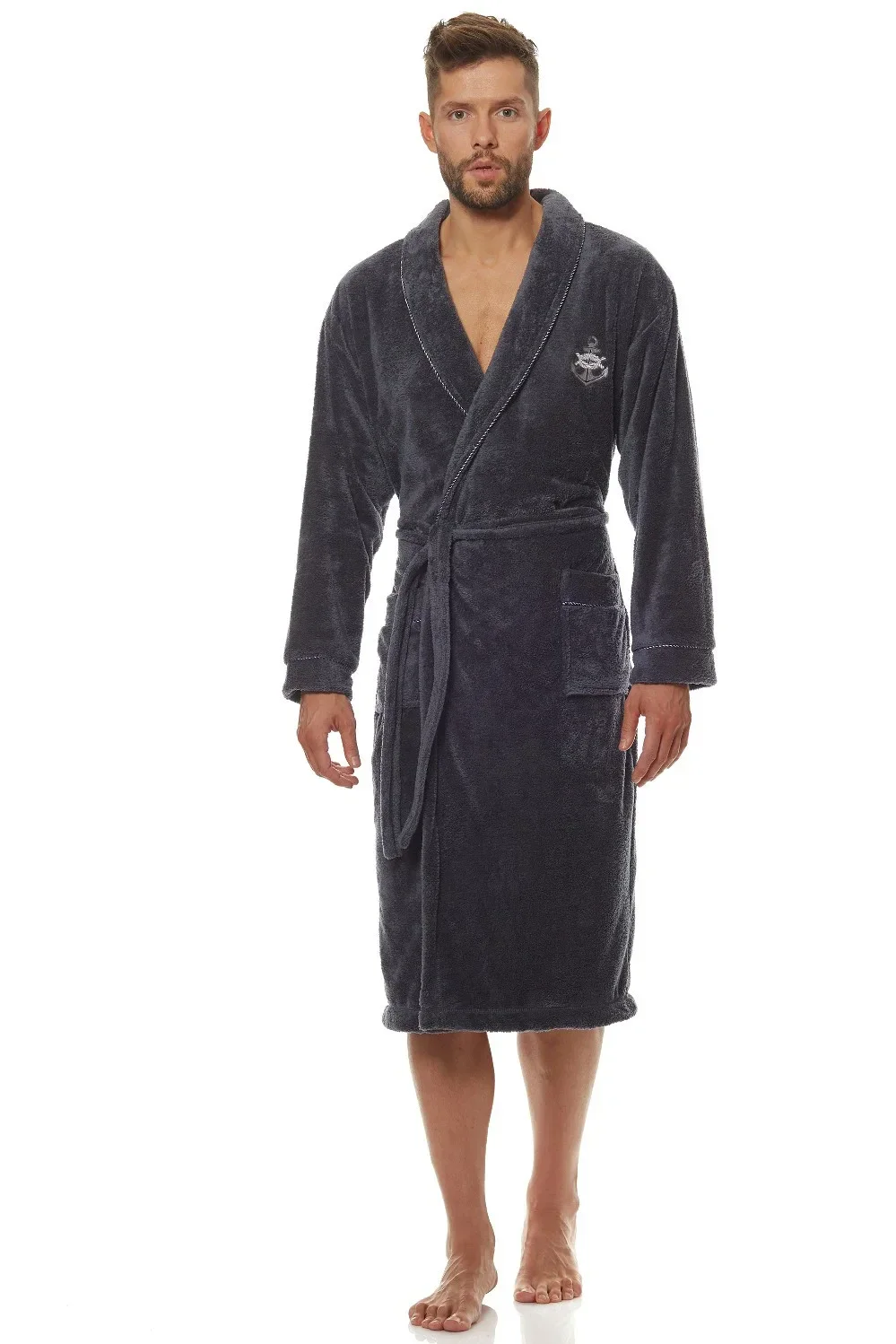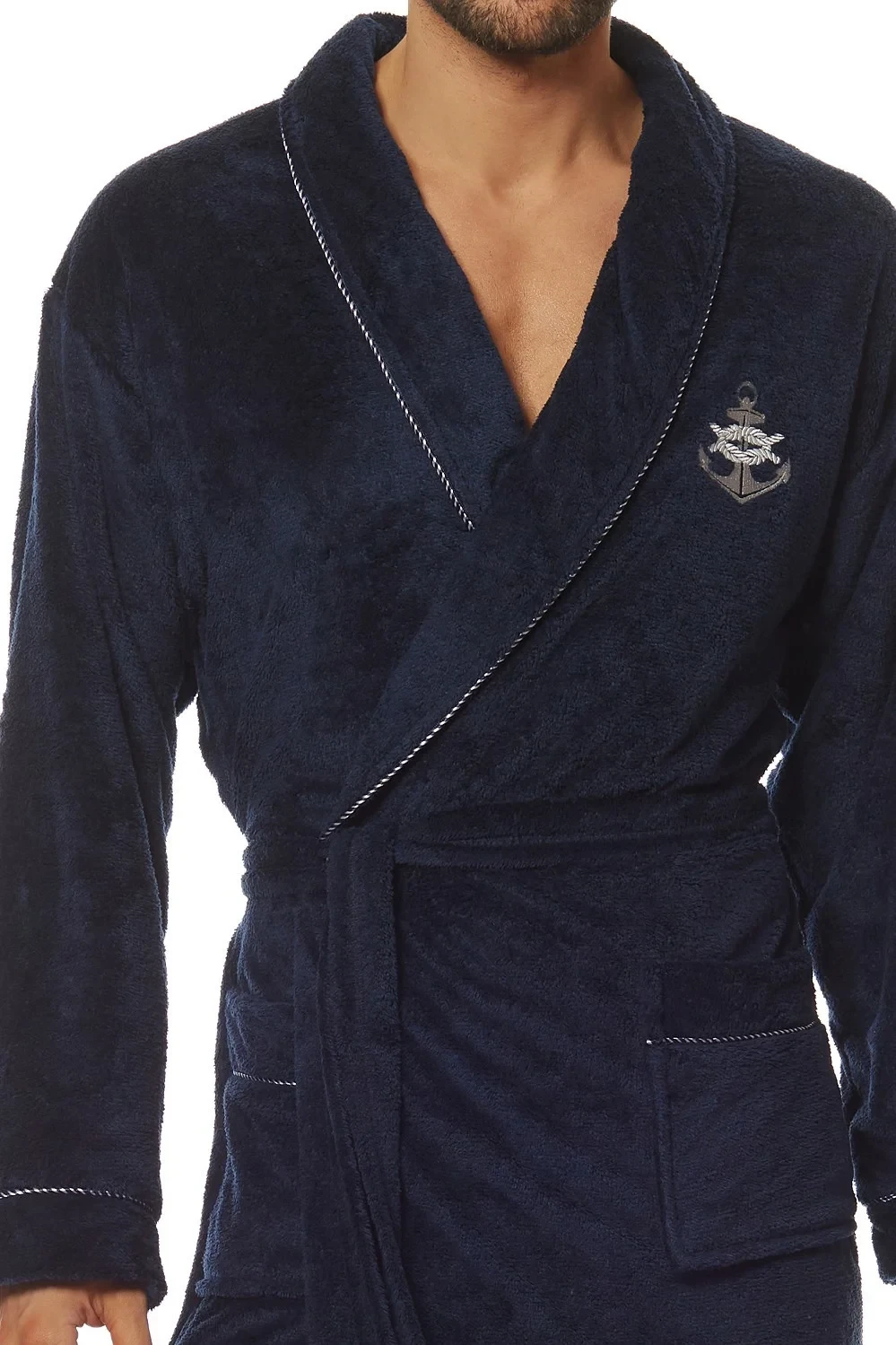 Župan je vyrobený z měkké a příjemné tkaniny. Model má na bocích pohodlné kapsy a v pase se zavazuje. Manžety a límec a jsou obšité přízí v kontrastní barvě.